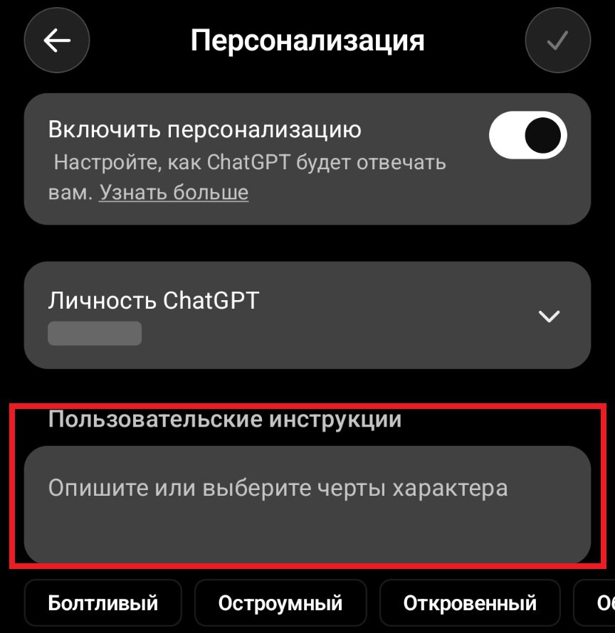 Настройка функции доступна всем пользователям как в мобильном приложении, так и с браузера. Для этого откройте ChatGPT, выберите свой профиль и перейдите в раздел настроек. Затем найдите пункт «Персонализация» и напишите пользовательские инструкции.