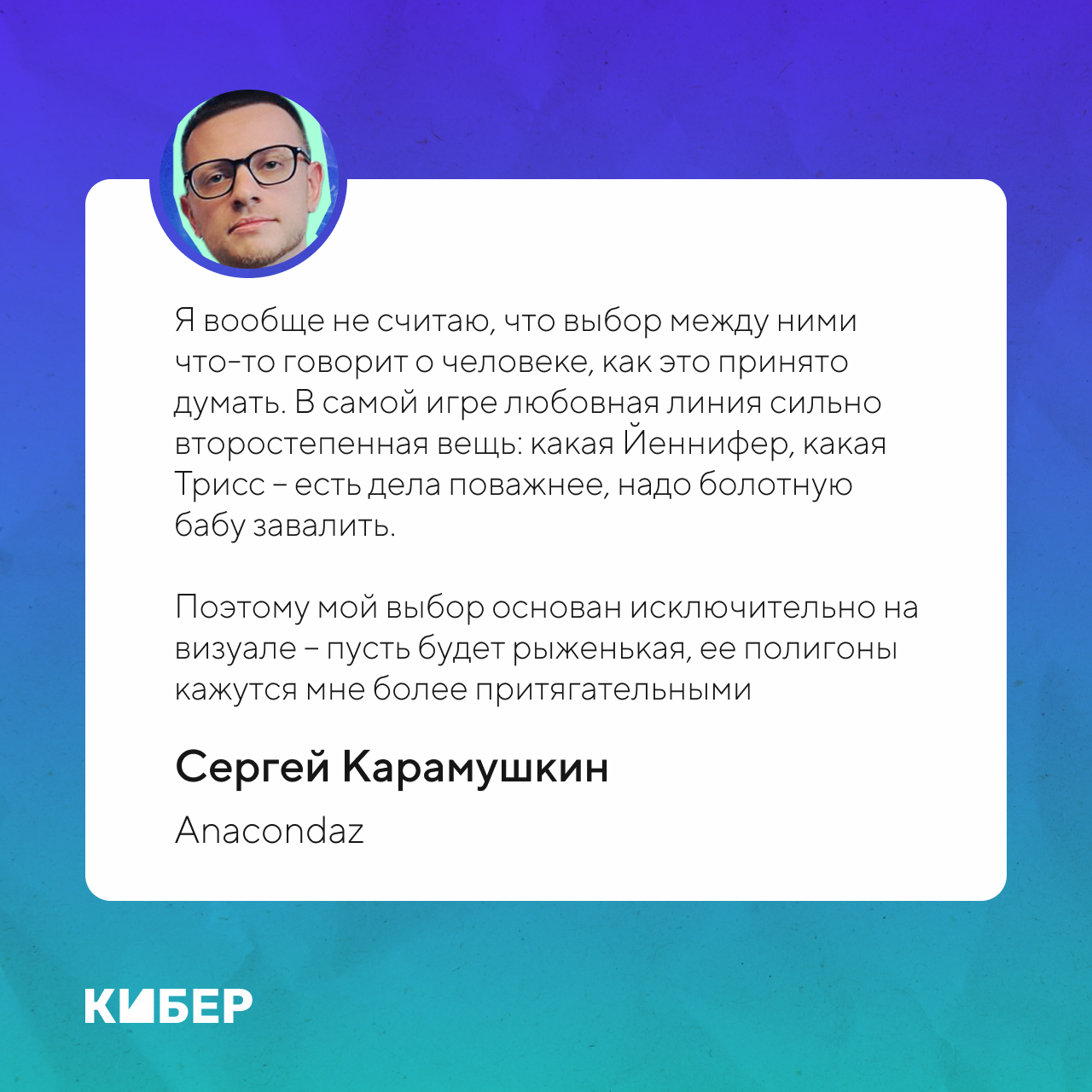 Сега: «Я вообще не считаю, что выбор между ними что-то говорит о человеке, как это принято думать. В самой игре любовная линия сильно второстепенная вещь: какая Йеннифер, какая Трисс – есть дела поважнее, надо болотную бабу завалить. Поэтому мой выбор основан исключительно на визуале – пусть будет рыженькая, ее полигоны кажутся мне более притягательными».
