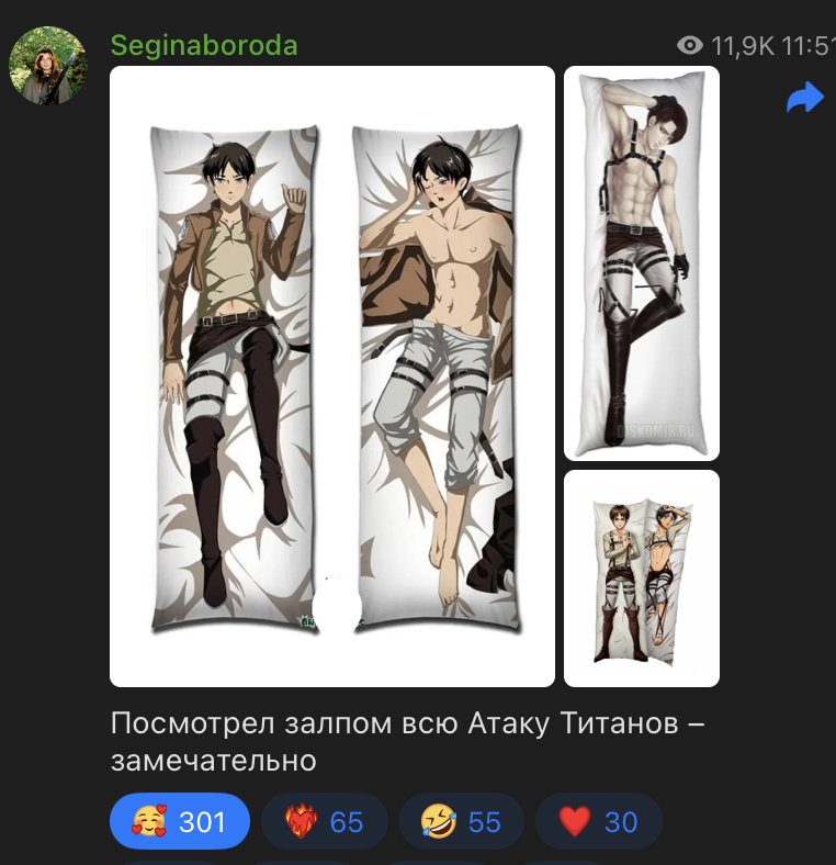 Сега: «Мне очень повезло, потому что я начал смотреть «Атаку титанов», как раз когда выходил последний сезон. Поэтому я поглотил всё взахлеб дней за десять и посмотрел финал вместе со всеми без спойлеров. Мое впечатление – потрясающе.