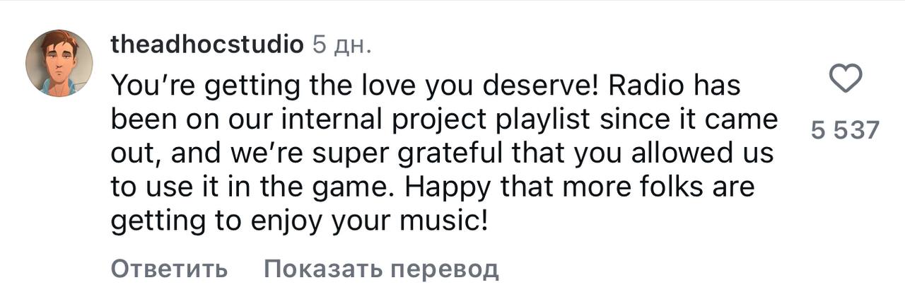 Официальный аккаунт AdHoc Studio тут же ответил в комментариях: «Ты получаешь заслуженную любовь! Radio играла в нашем плейлисте с момента ее выхода – мы очень благодарны, что ты позволила нам использовать песню в игре».