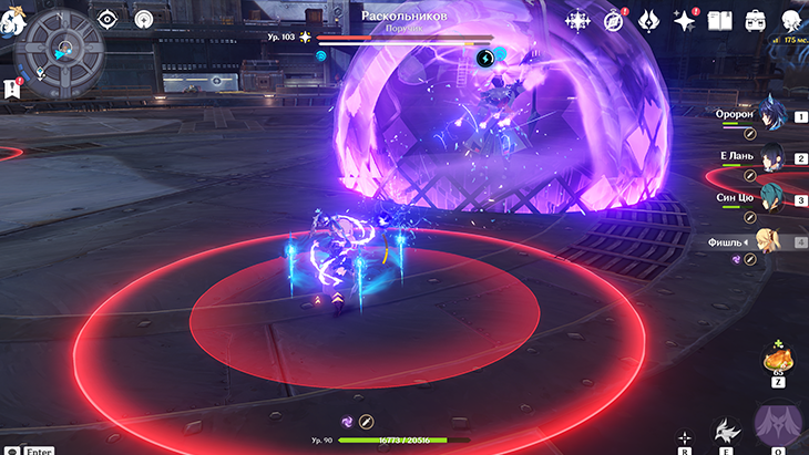 В бою он периодически создает Экспериментальный мультищит. Чтобы разрушить его, нужно быстро нанести много элементального урона. Подойдут заряженные атаки или персонажи, которые могут наносить урон вне поля боя. Разрушив щит три раза подряд, вы оглушите босса и сможете спокойно атаковать его.