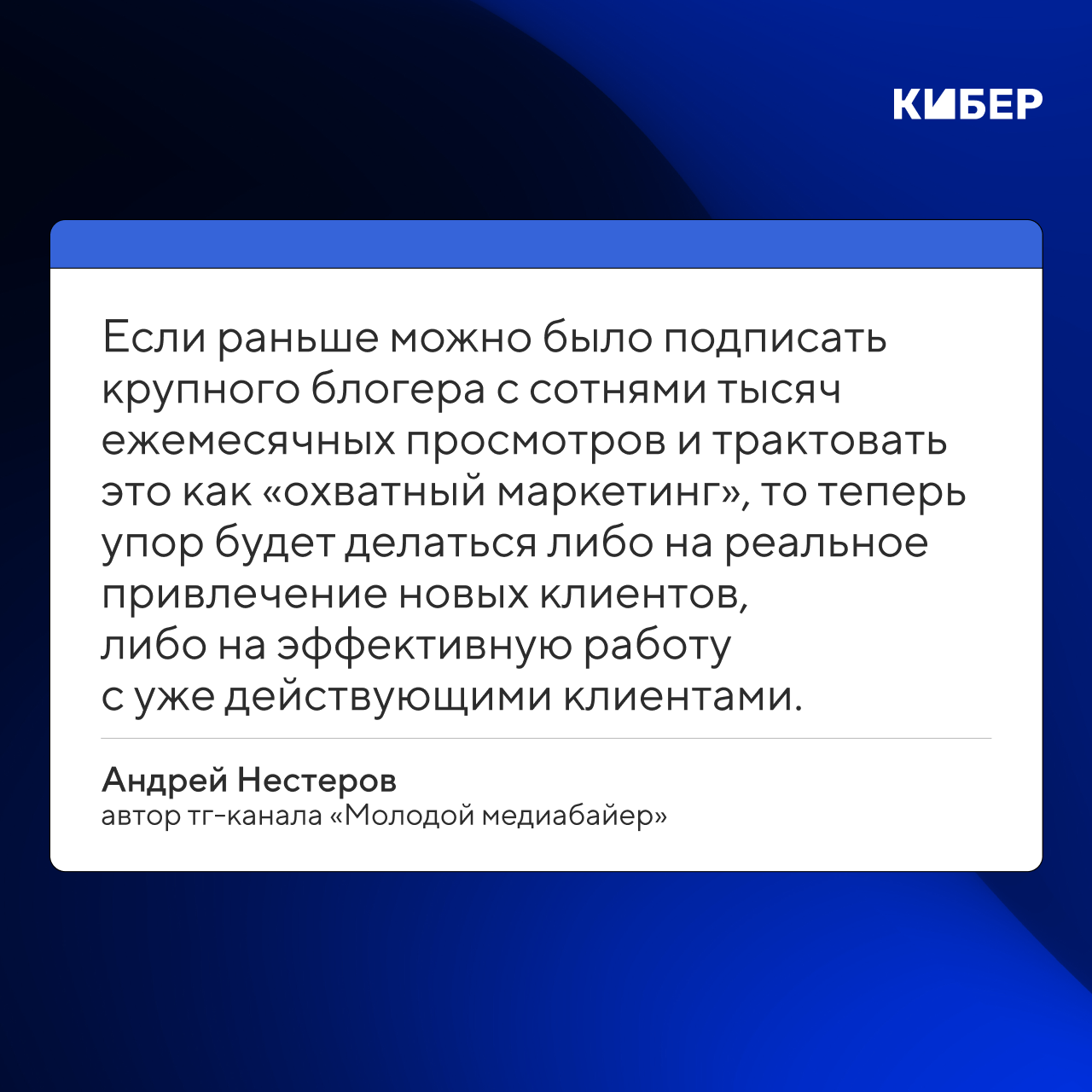 Андрей Нестеров, менеджер по работе с инфлюенсерами в одной из крупных БК и автор тг-канала «Молодой медиабайер», считает, что долгосрочные контракты никуда не пропадут. Это выгодно как компаниям, так и инфлюенсерам. Однако теперь больше внимания будет уделяться реальному привлечению новых клиентов и работе с уже действующими.