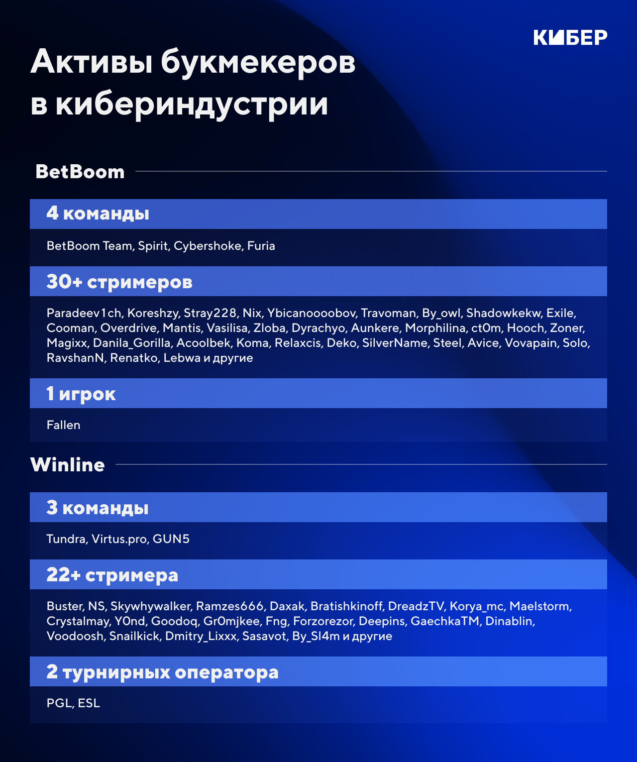 Самые активные на рынке – BetBoom и Winline. Им принадлежит почти половина всех контрактов в кибериндустрии. Fonbet и PARI отстают, но у них есть свои козыри: студии, которые освещают крупные турниры по Доте и КС.