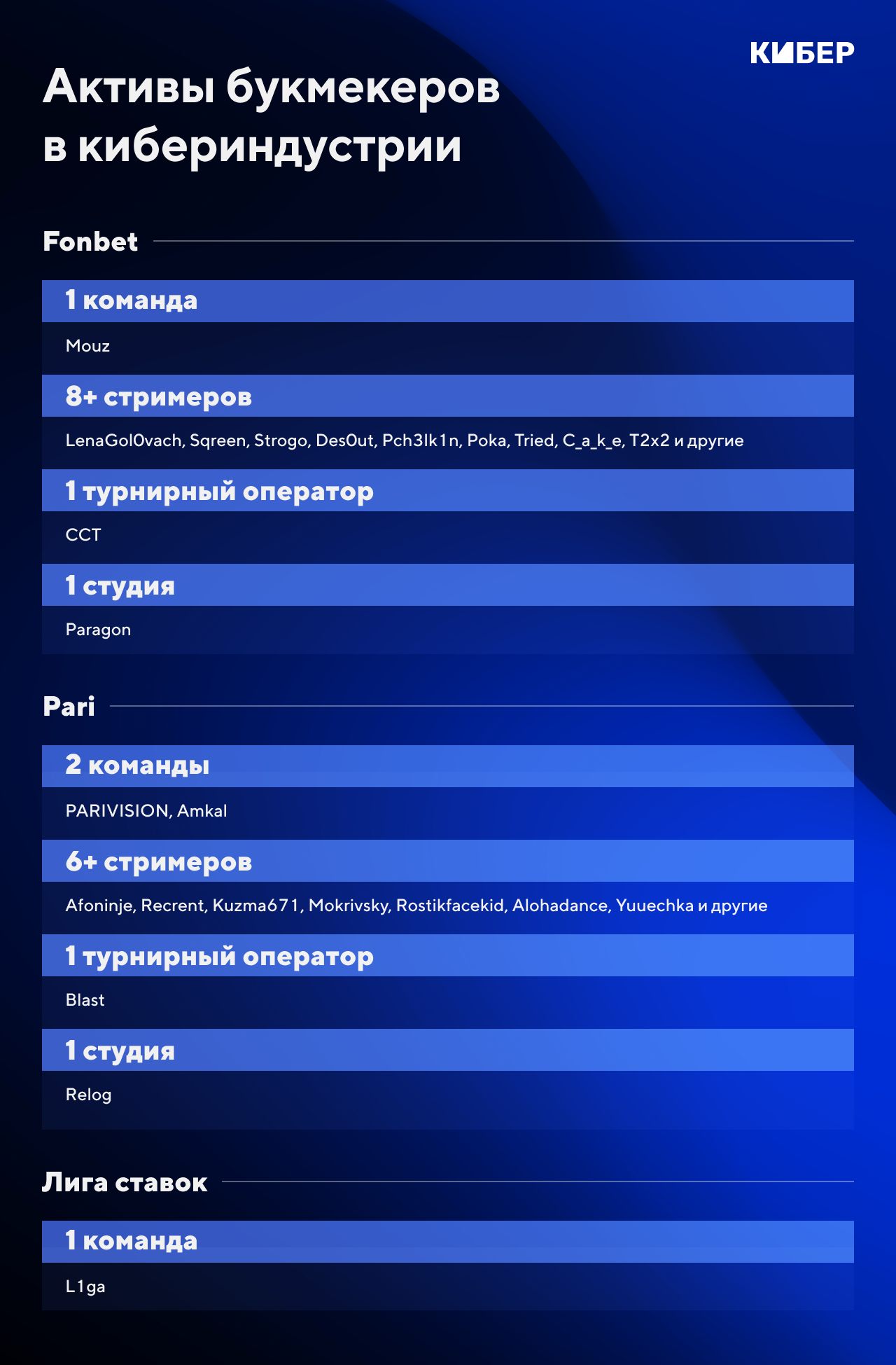 Если в двух словах – очень сильно. БК спонсируют команды, турнирных операторов, кастерские студии, заключают амбассадорские контракты с игроками, стримерами и блогерами. На графике можно увидеть неполный список киберспортивных активов БК.