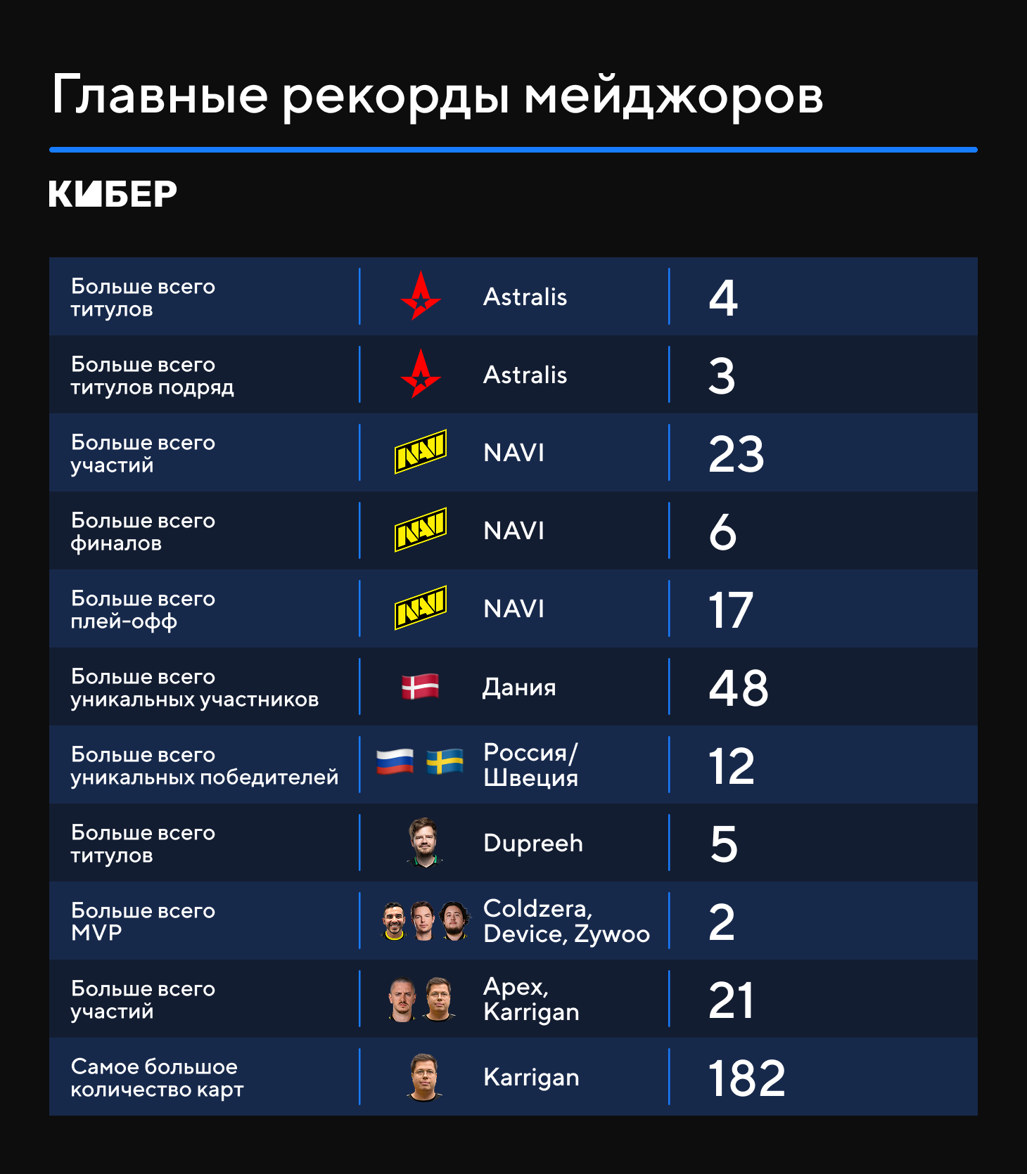 ● Успех Astralis закрепил Данию в лидерах мирового CS: 48 датчан добирались до главного турнира, на втором месте – Россия с 46 игроками. Датчане чаще всех побеждали на мейджорах и добирались до топ-4. Но среди уникальных победителей мейджоров впереди Россия и Швеция – по 12 человек.