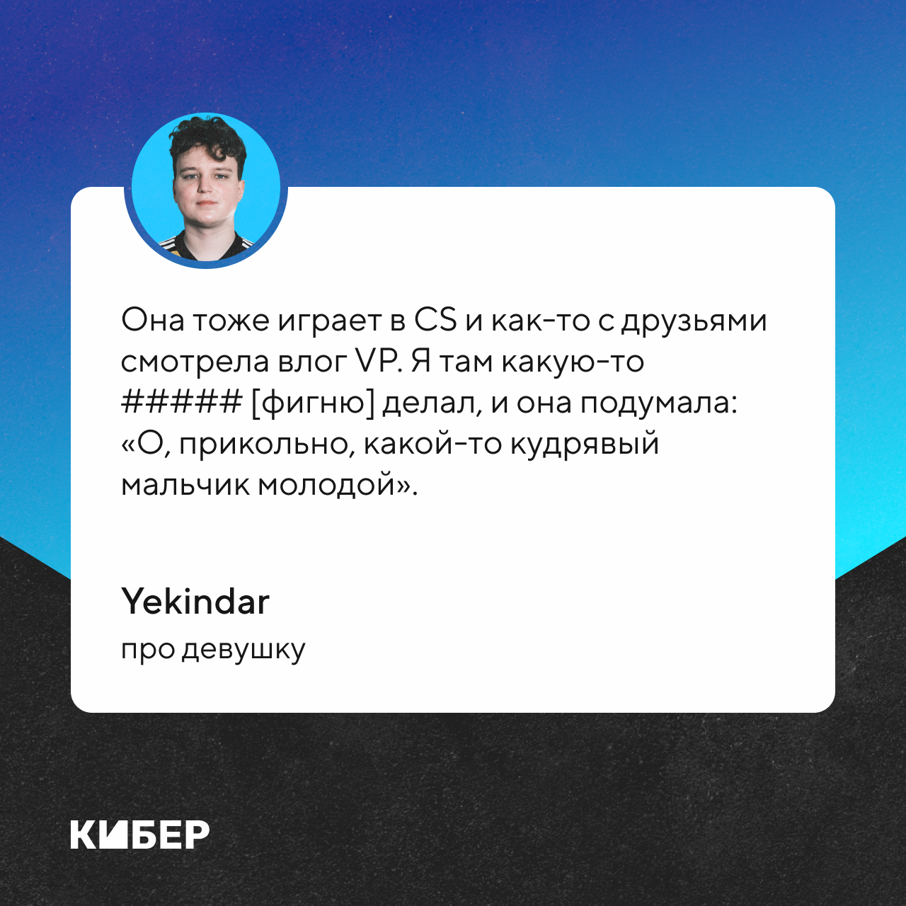 Знакомы мы примерно четыре года. Она написала мне в Инстаграме, а потом удалила сообщение. Но я увидел уведомление и тоже написал. Так все и началось. Она тоже играет в CS и как-то с друзьями смотрела влог VP. Я там какую-то ##### [фигню] делал, и она подумала: «О, прикольно, какой-то кудрявый мальчик молодой».