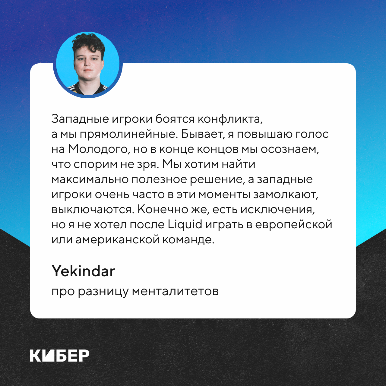 – Я и сам постоянно говорю, что западные игроки боятся конфликта, а мы прямолинейные. Бывает, я повышаю голос на Молодого, но в конце концов мы осознаем, что спорим не зря. Мы хотим найти максимально полезное решение, а западные игроки очень часто в эти моменты замолкают, выключаются. Конечно же, есть исключения, но я не хотел после Liquid играть в европейской или американской команде.