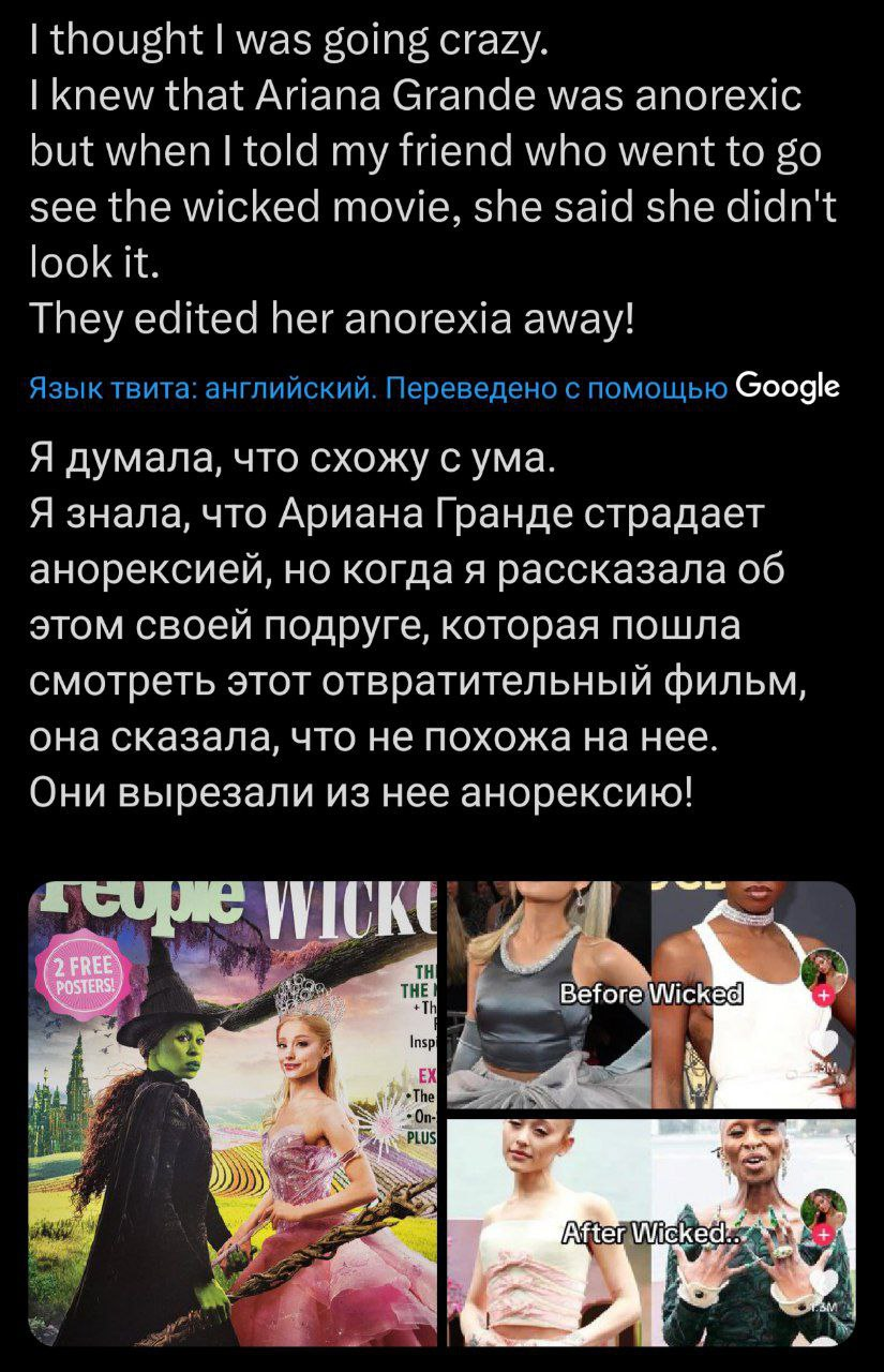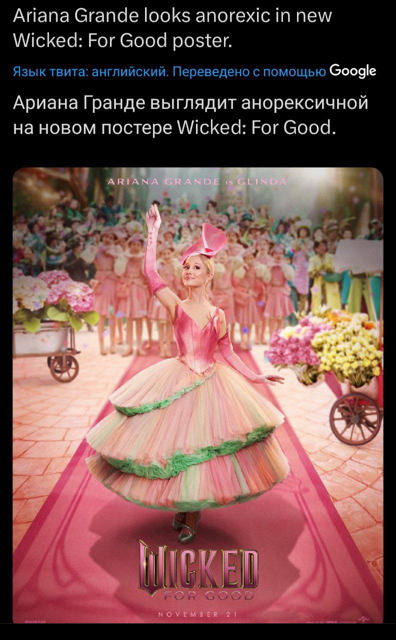 21 ноября в прокат вышла «Злая. Часть 2». Однако обсуждают сейчас не только сам фильм или пресс-тур в его поддержку, но и внешний вид главной звезды – Арианы Гранде. Стоило певице появиться на первых интервью, как соцсети заполнились комментариями о том, как она выглядит. Все снова переживают из-за ее болезненной худобы.
