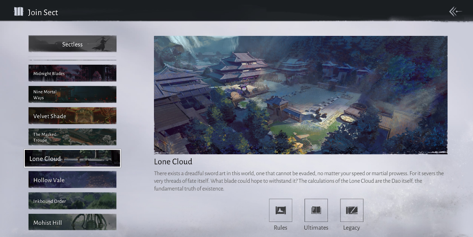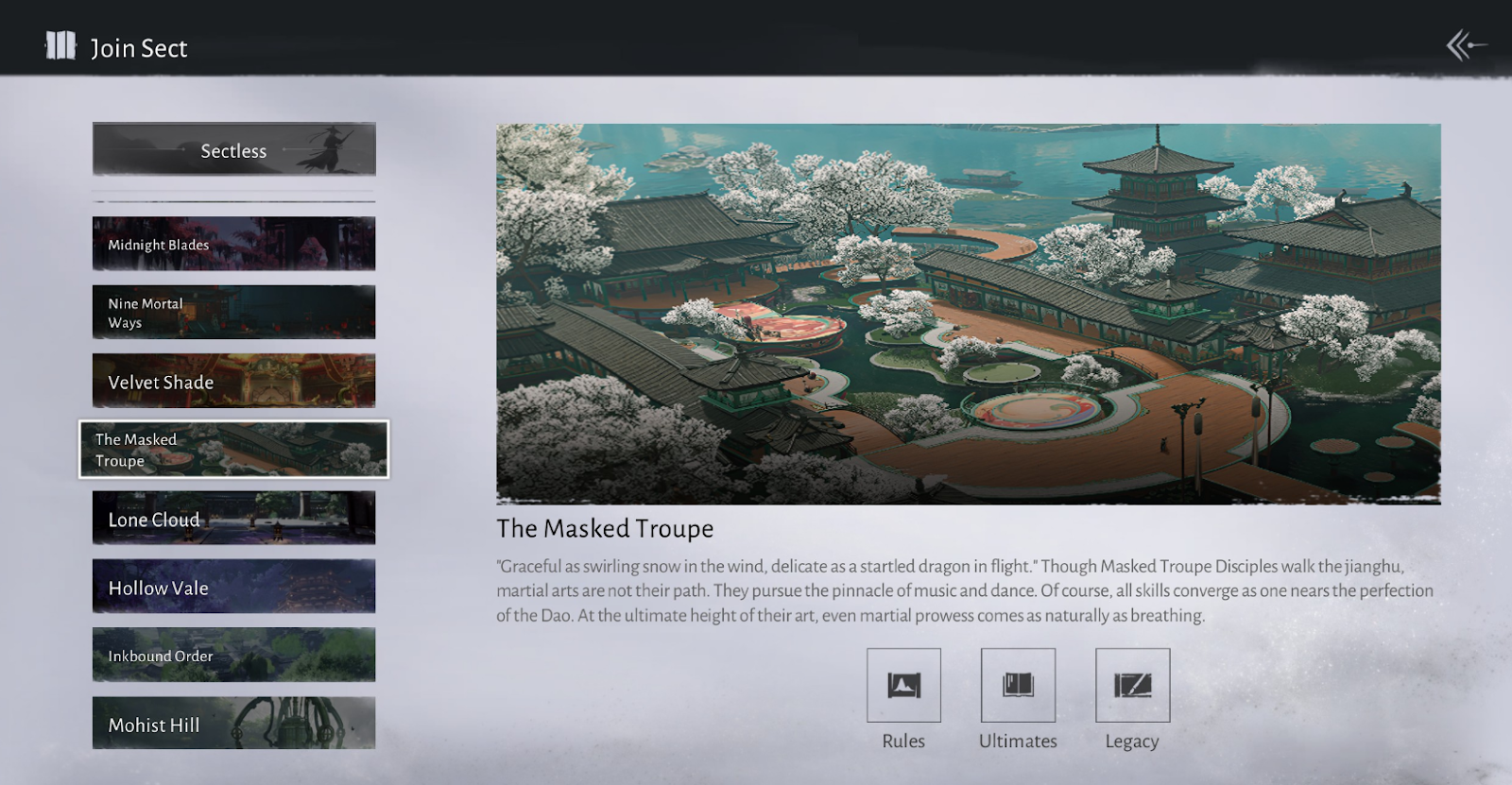 Эта секта о тысячелетиях перевоплощений. Участвуйте в метаморфозах, сливаясь с девятью жизненными путями, чтобы прожить разнообразные судьбы. Неудачные трюки влекут потери добродетели.