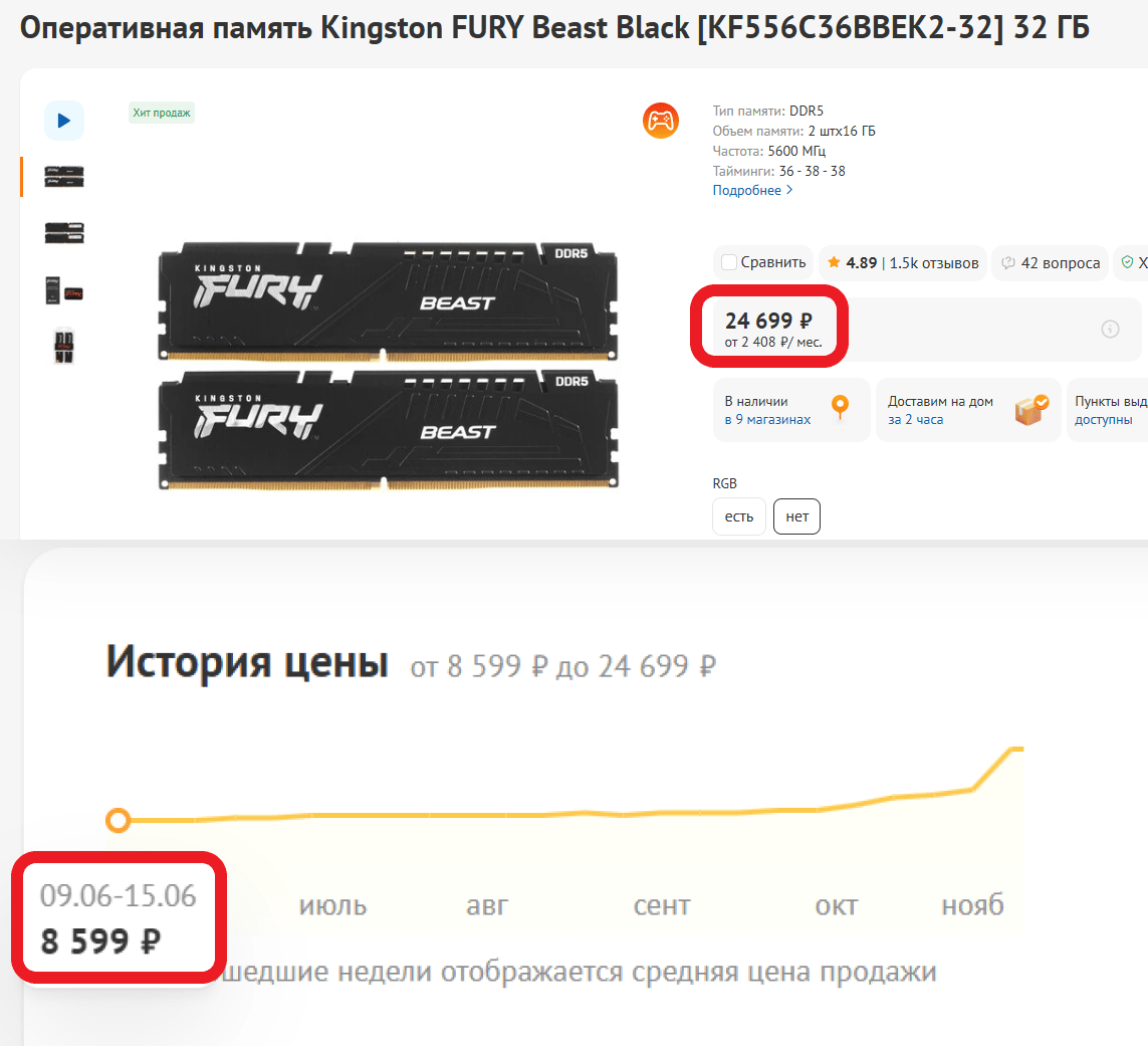 И аналогичная ситуация наблюдается на отечественных площадках. В России также взлетели цены на память в 3 раза. В DNS можно наглядно проследить как росла стоимость – на легкий взлет ОЗУ пошла во второй половине октября, ускорившись уже в ноябре.