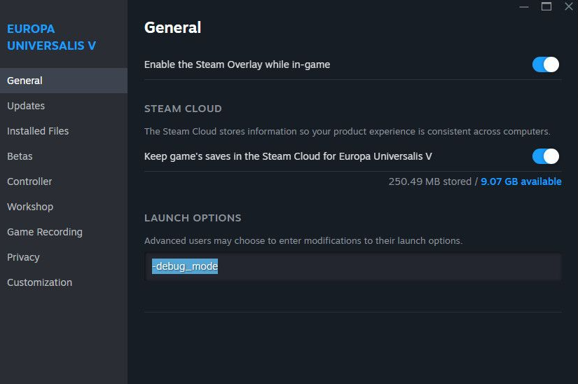 - Если версия не через Steam: можно создать ярлык на eu5.exe, и в свойствах ярлыка в поле «Объект» после кавычек добавить -debug_mode.