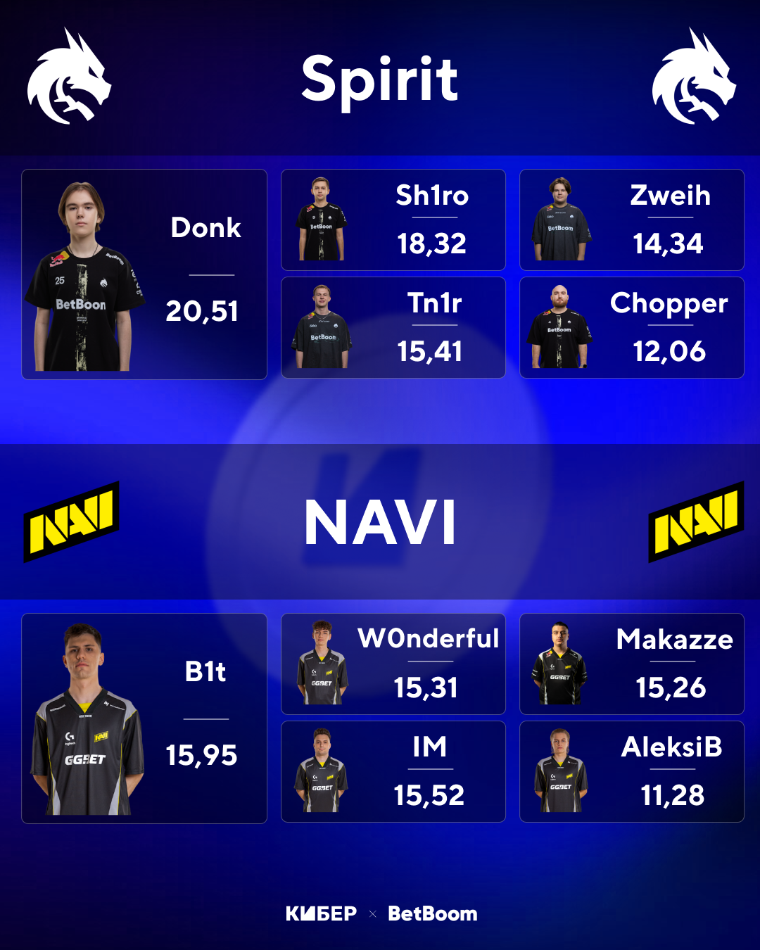 ➢ В NAVI сразу четверо дают больше 15 фрагов, а вот Алекси в топе худших.