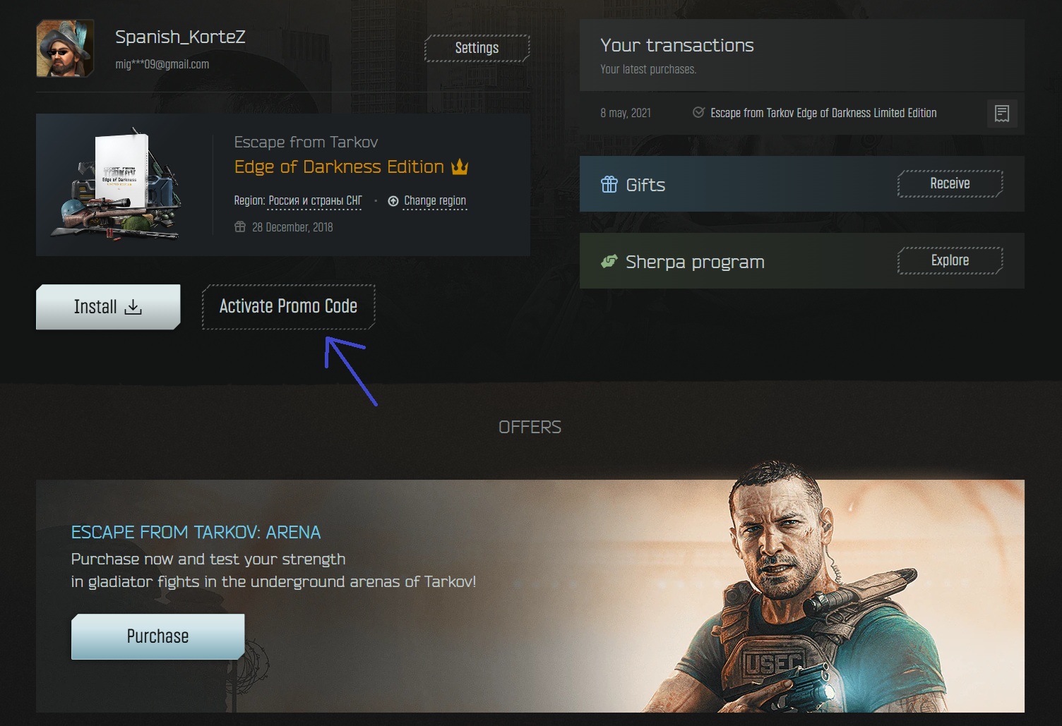 В появившемся меню ищем кнопку «активировать промо-код». Нажимаем на неё. Появляется окно, в которое и надо вводить код.