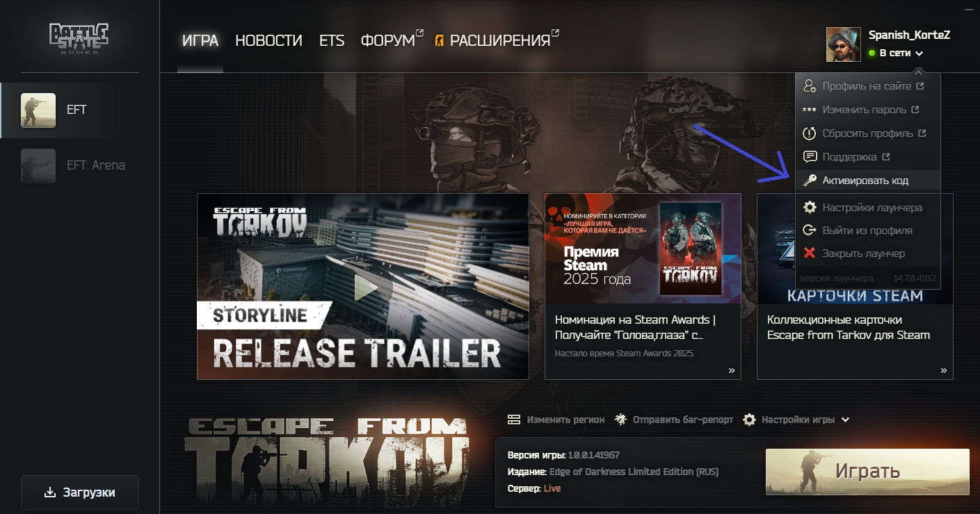 В лаунчере игры: кликаете по своему профилю в правом верхнем углу и выбираете «активировать код». Нужный код вводите в появившееся окно.