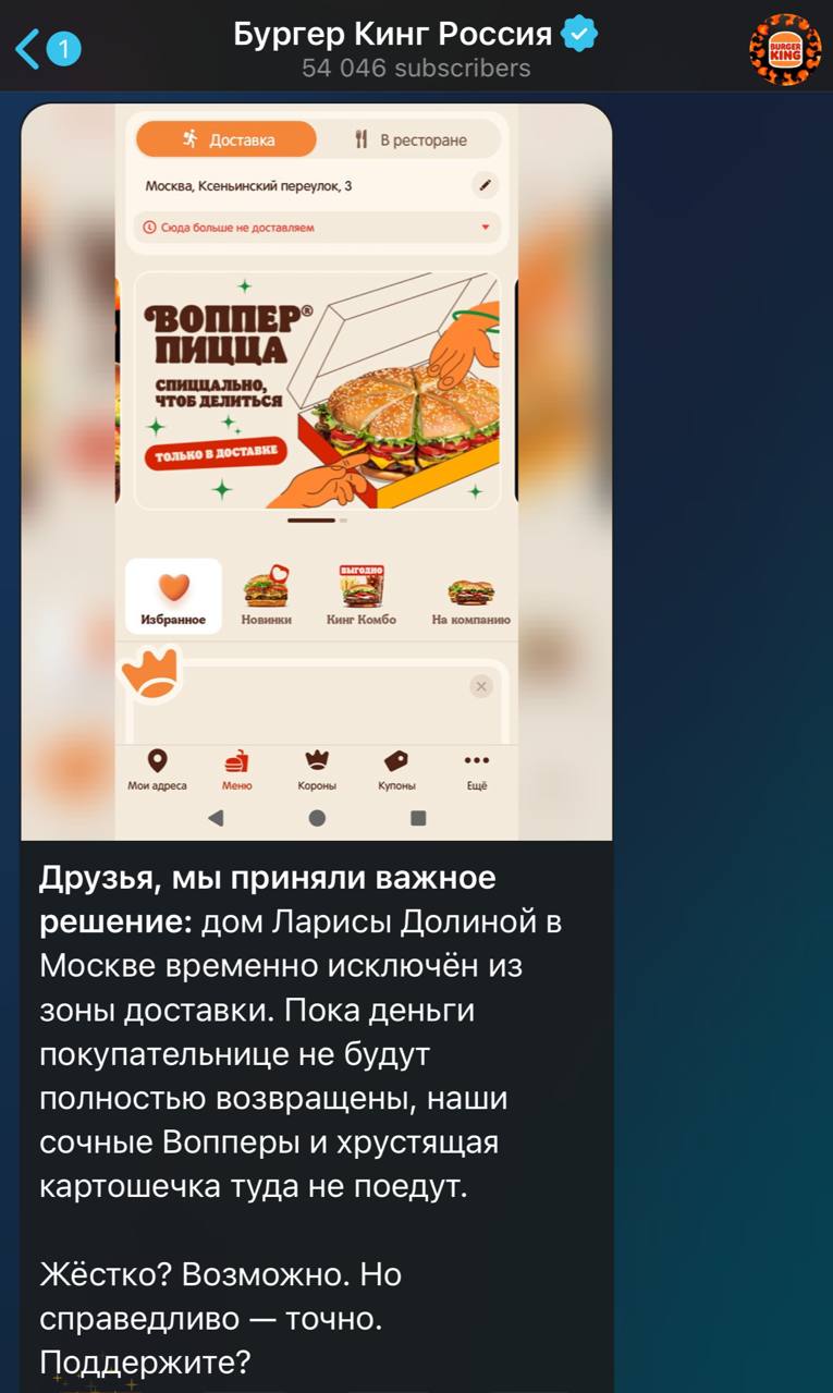 - Burger King исключил адрес певицы из зоны доставки: