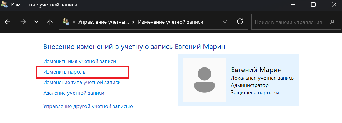 Не самый очевидный, но очень короткий путь к установке стандартного пароля на вход в Виндовс 11. Здесь мы используем встроенную функцию его замены, однако она подходит и для назначения – отсутствие пароля винда принимает за существующий, но «пустой».