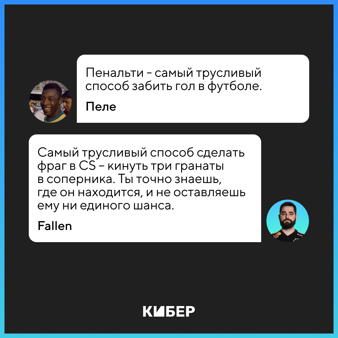 – Пеле однажды сказал, что пенальти – самый трусливый способ забить гол в футболе. А какой самый трусливый способ дать фраг в CS?