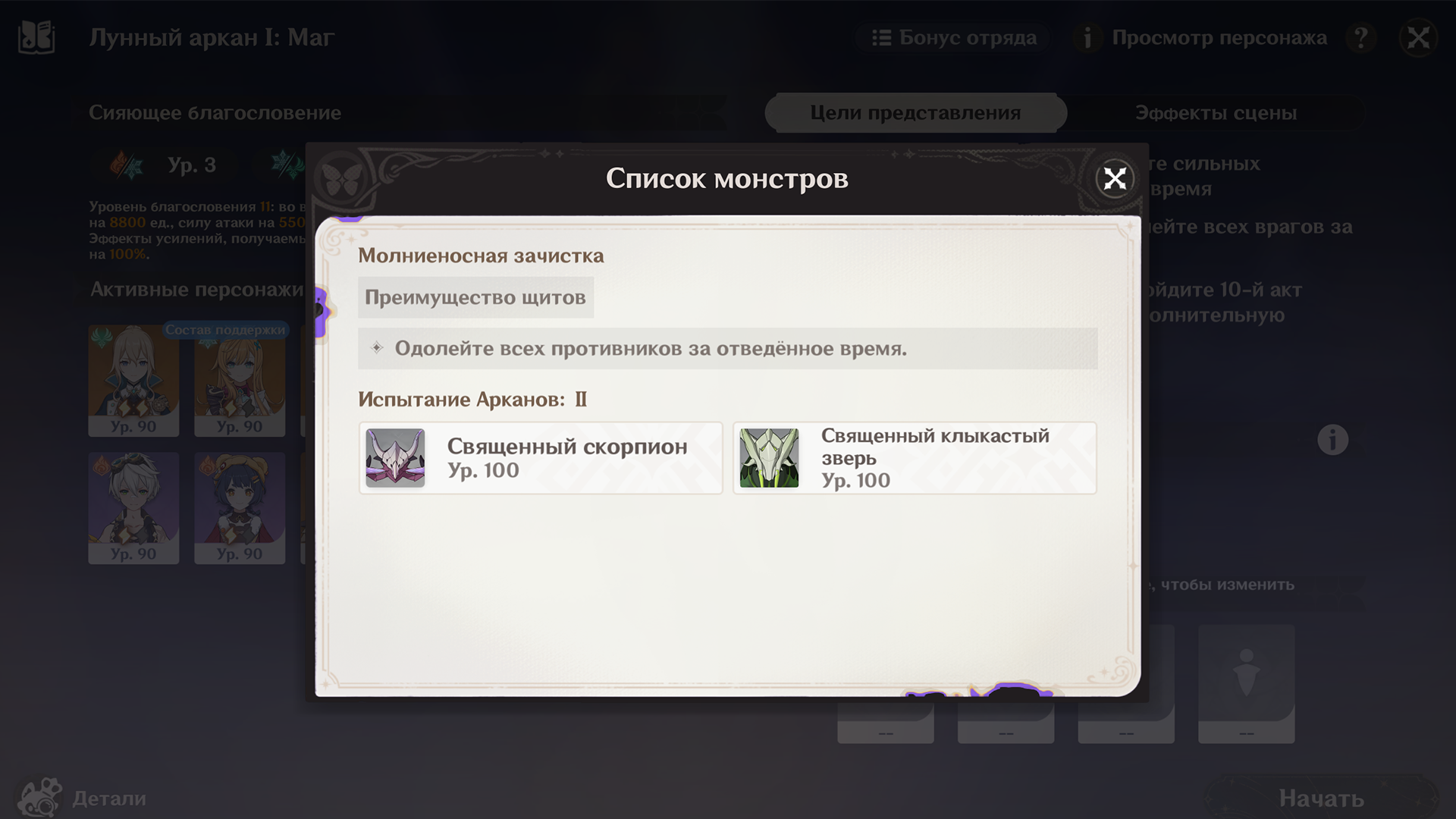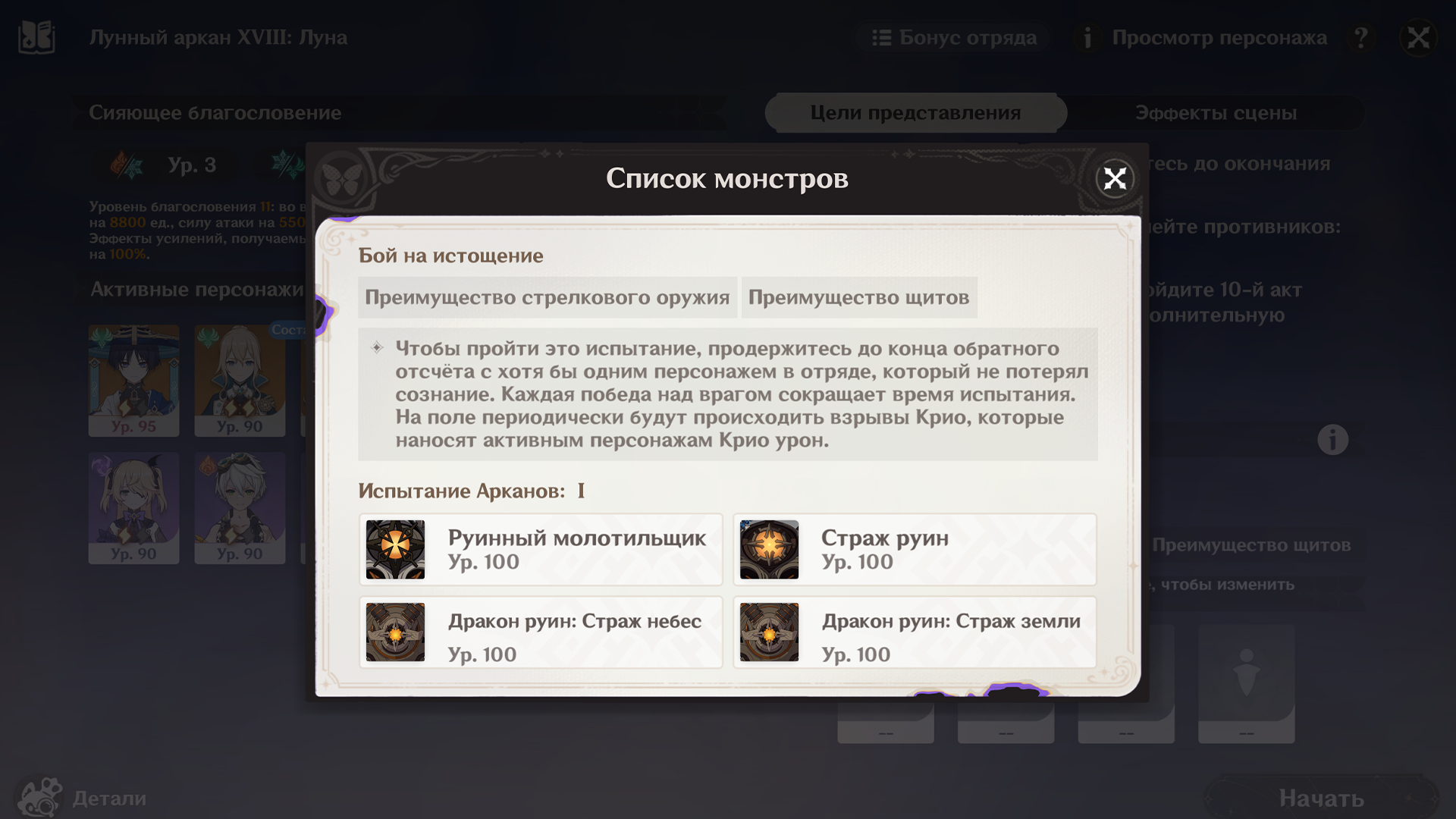 ● Акт 3 (Древний Геовишап): нужны щиты, потому что отражение урона сильно ускоряет бой. Используйте Ситлали, Диону или Лайлу. К ним добавьте любого Пиро, Крио или Анемо дамагера.