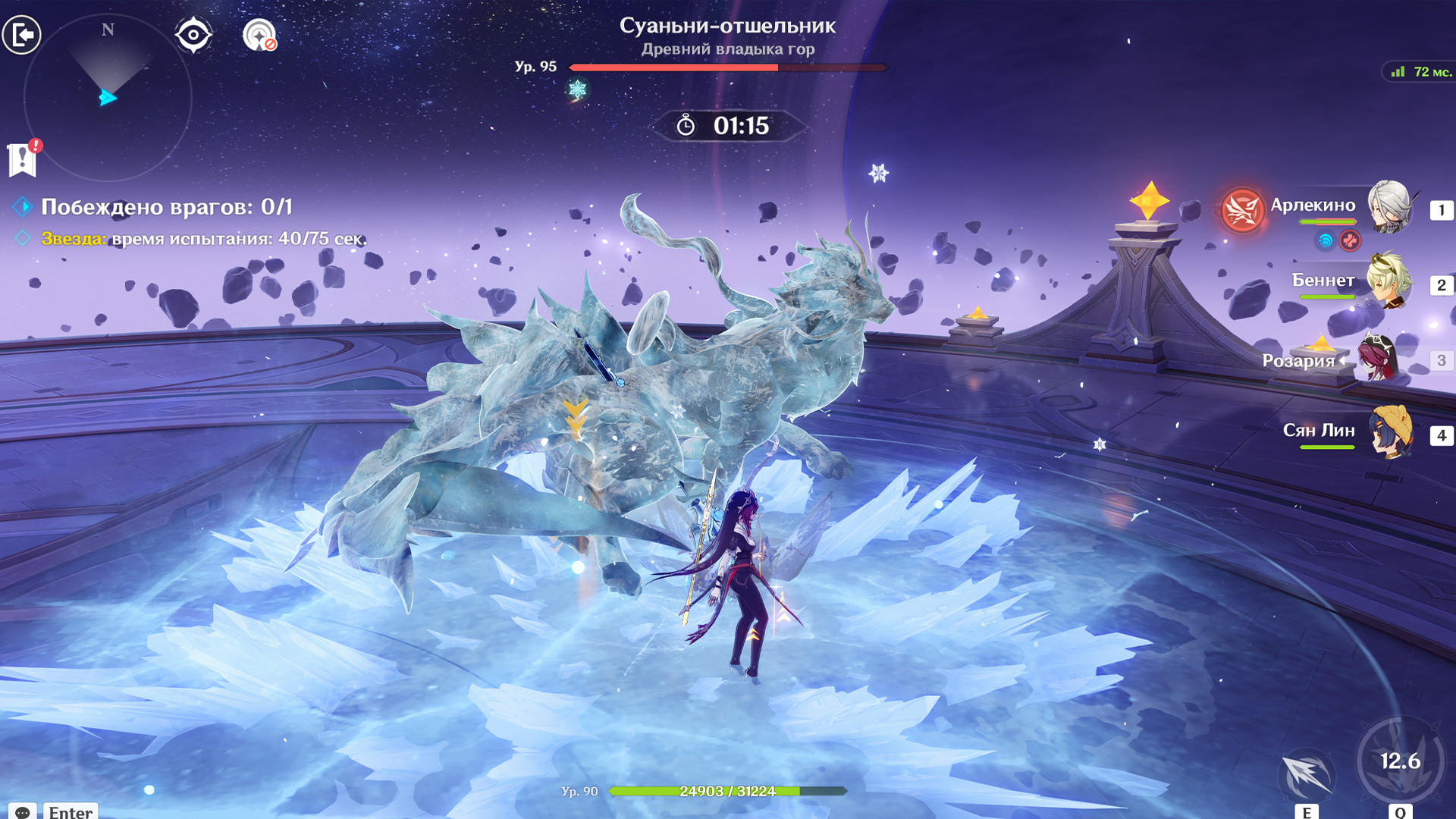 В первой фазе Суаньни покрывается Гидро аурой и готовится выпустить мощный взрыв. Заморозьте его Крио героем, а затем активируйте реакцию Таяния через Пиро или разбейте лед ударом двуручного меча. Атаки в падении тоже работают.