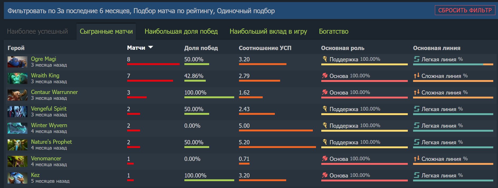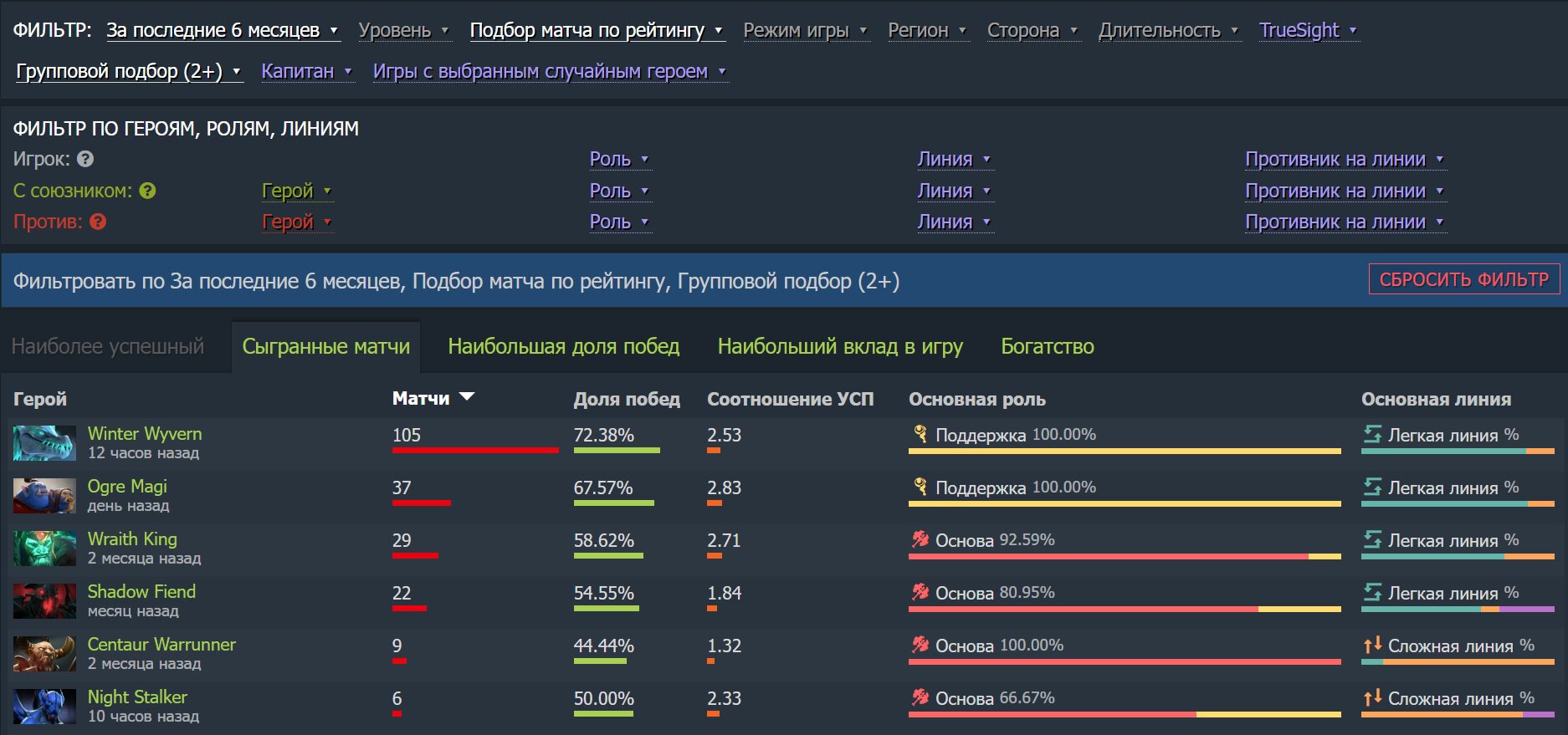 Для этого детально разберем его матчи на Dotabuff за последние 6 месяцев – именно в этот период Андрей апнул свой наибольший публично известный MMR. Его Дотабафф открыт, поэтому изучить статистику несложно.