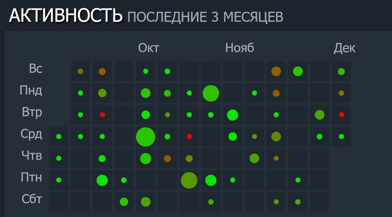 И практически во всех матчах в пати Андрея был некто с ником «30lvlhero», текущим рангом «Божество I» и вот такой картой активности за последние 3 месяца, пик которой приходитcя на октябрь и, чудесным образом, полностью синхронизирован с пиком Андрея Иммершена. Совпадение?