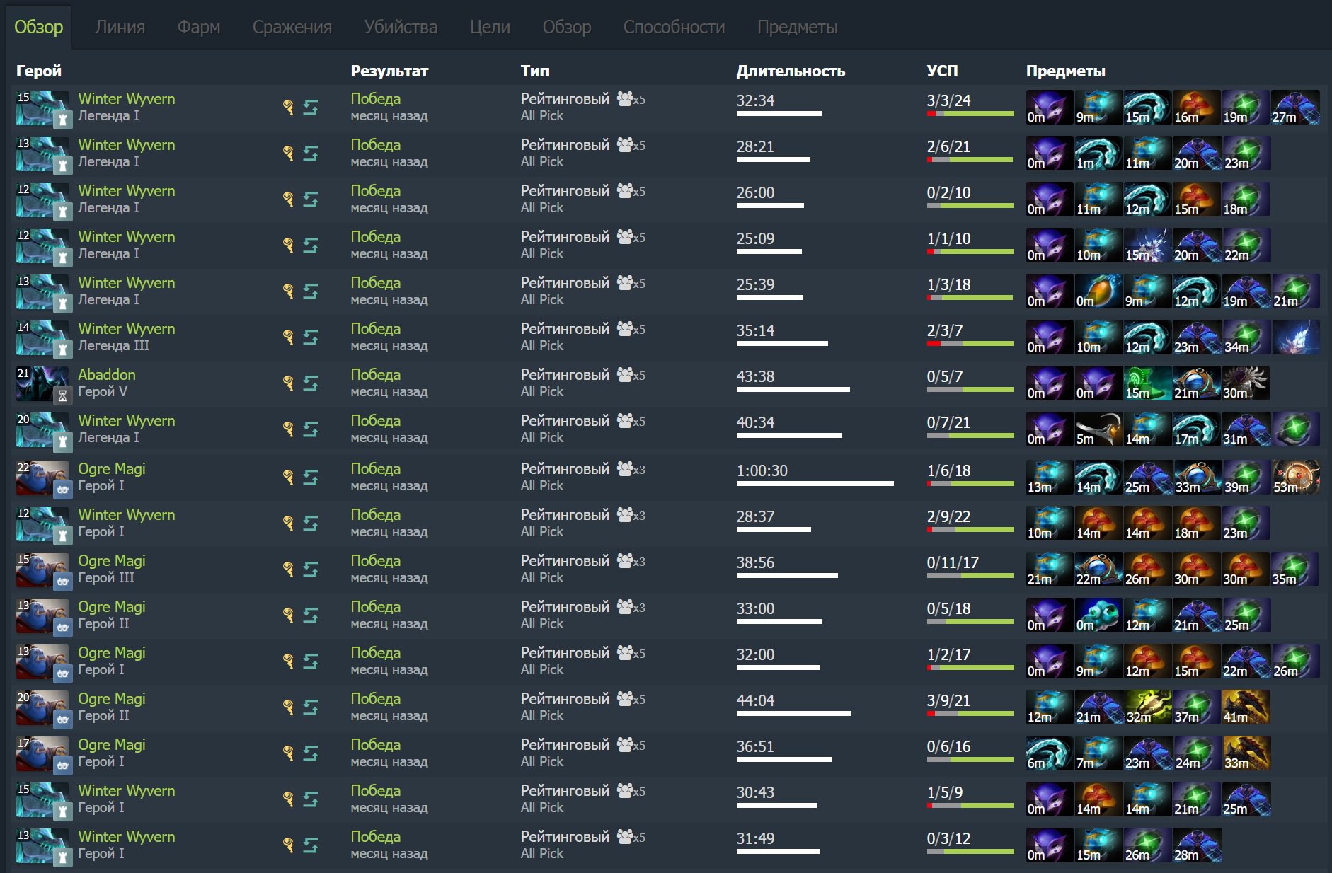 А где-то два месяца назад, в конце сентября-начале октября, как это видно на графике распределения матчей выше, Андрей начал дико стриковать в полном пати (реже – пати из трех человек). И играл в основном на двух героях – Огре и Виверне.