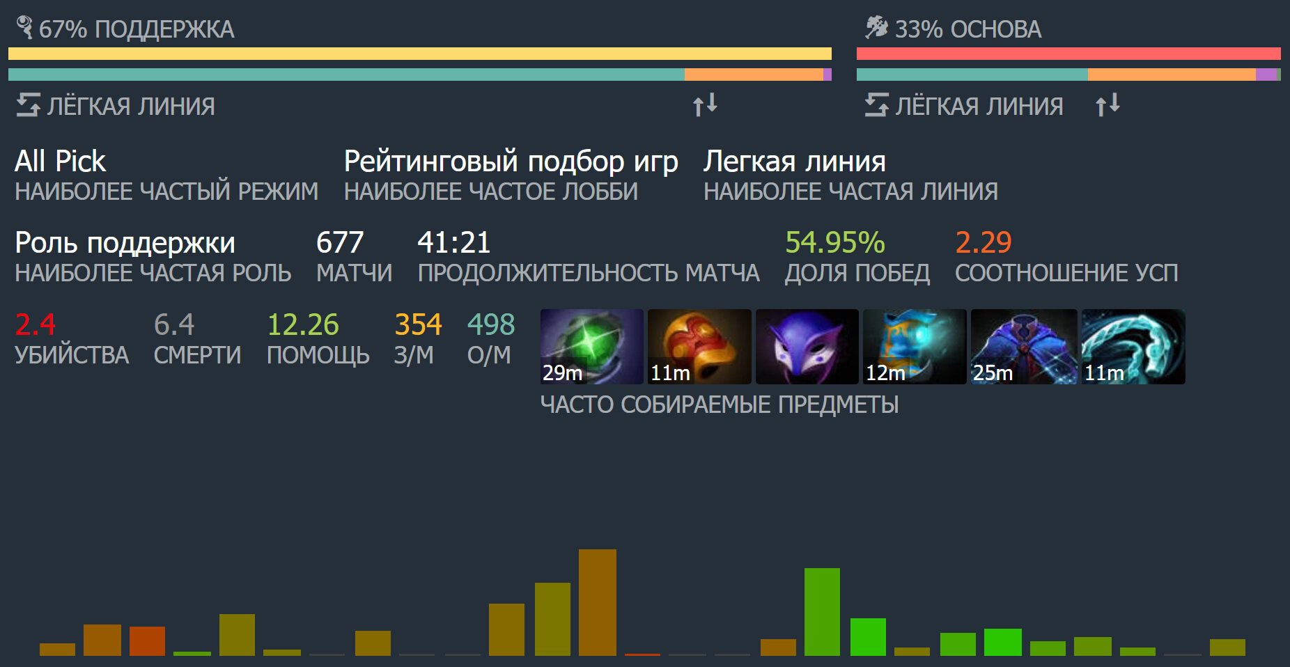 За последние полгода Андрей сыграл всего 677 рейтинговых матчей – нехарактерно маленькое для него число. И на графике распределения матчей за последние полгода отчетливо видно, что явный подъем рейтинга начался в конце сентября, вместе со снижением общего количества рейтинговых матчей. При этом баланс матчей сместился на 2/3 в сторону поддержки (67% на 33%), а среди самых частых предметов появились Arcane Boots, Glimmer Cape и Wind Lace.