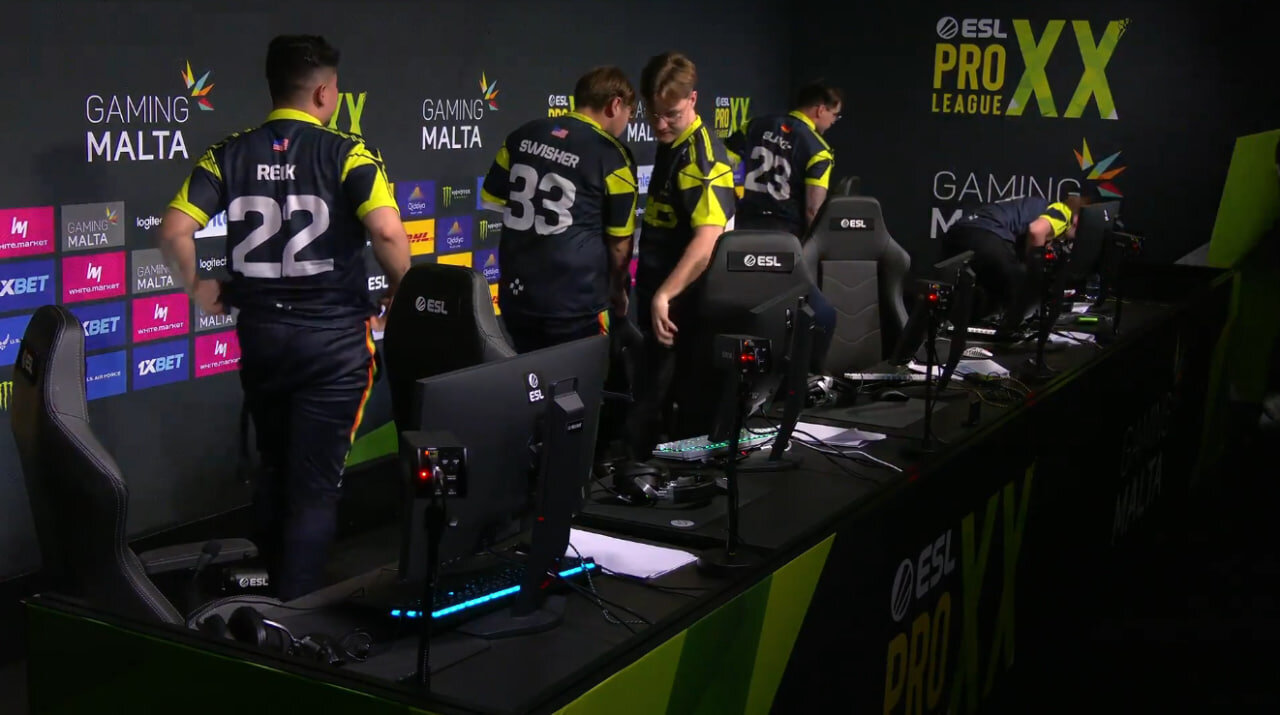 Так было в серии M80 и Fnatic на EPL S20: командам разрешили встать из-за компьютеров на счете 32:31 (матч закончился 37:34 в пользу M80). Перед этим в чате CS Bodyy спрашивал: «Кто хочет писать?» Swisher ответил: «Я», а Reck: «Я последние 20 раундов».