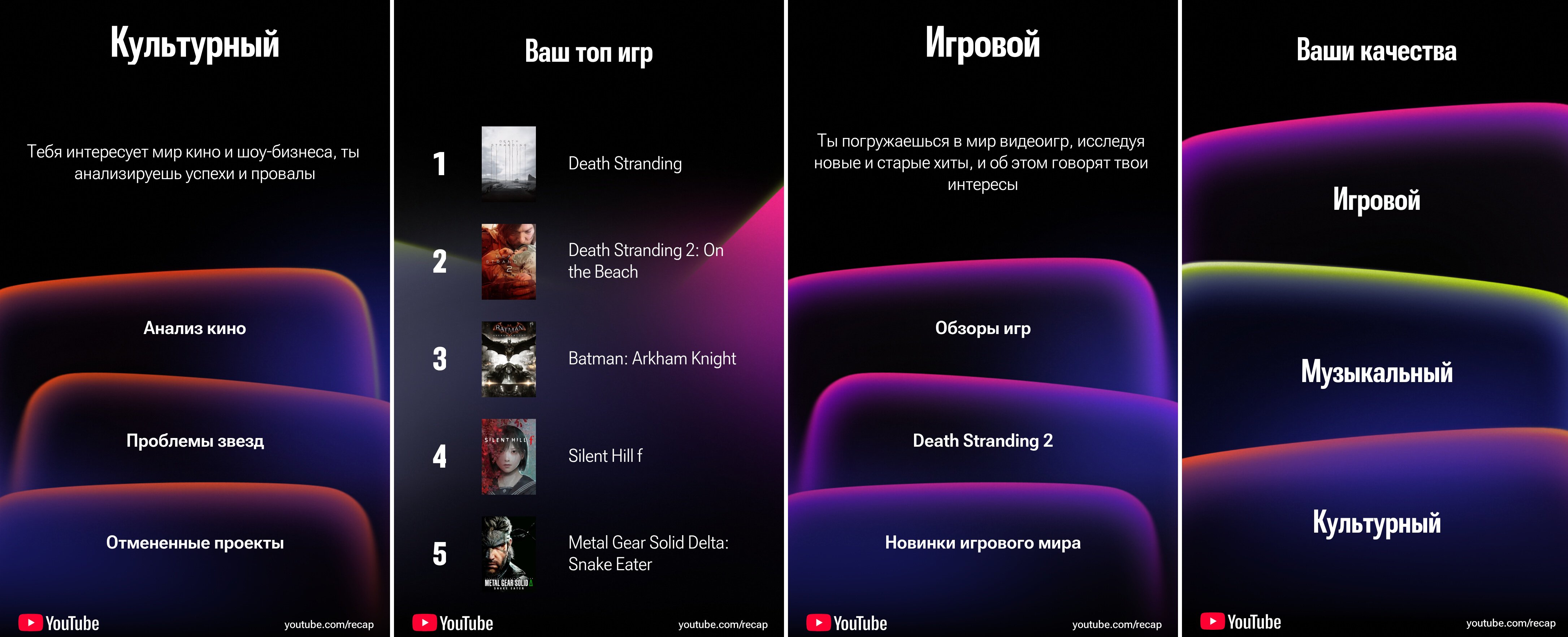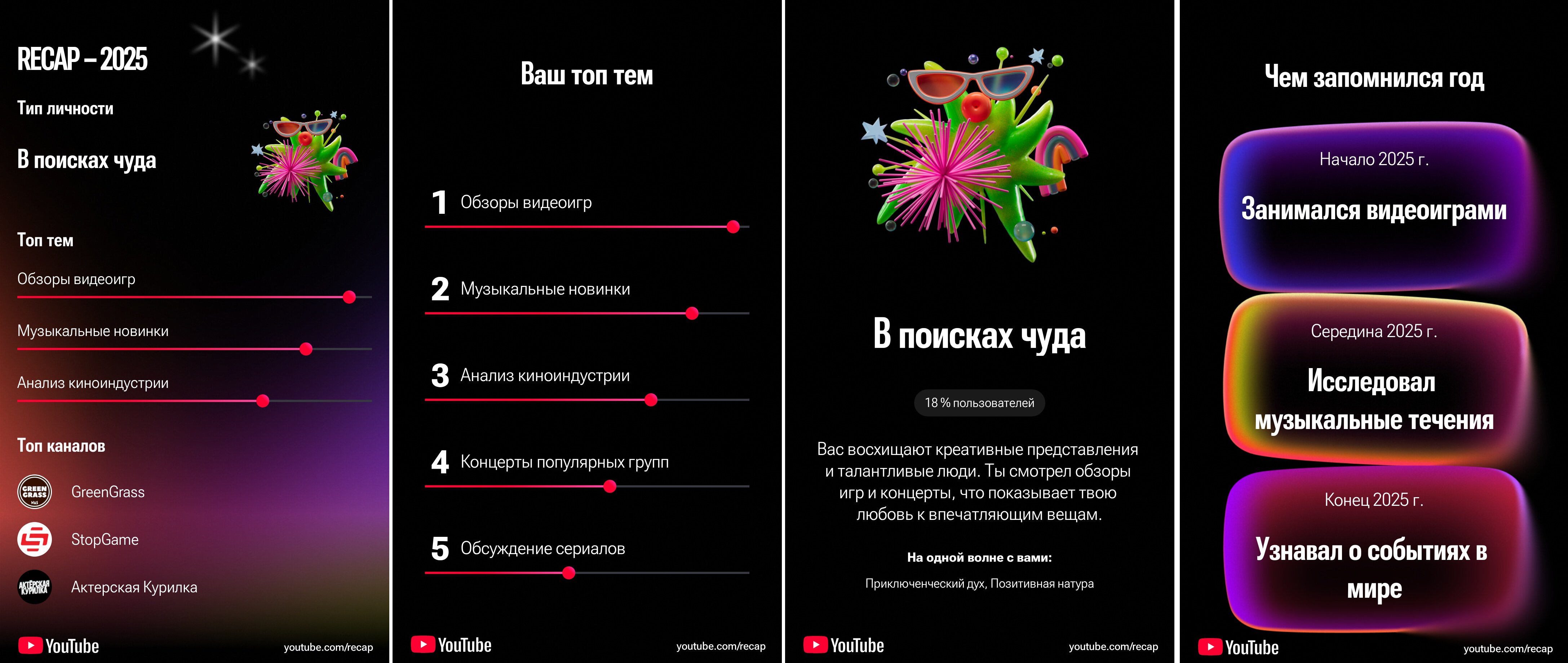 В 2025 году YouTube наконец-то не остался в стороне от подведения персональных итогов года. Google запустила YouTube Recap (не путать с Rewind!) – итоговую статистику пользователя на платформе. Она представляет собой 12 вертикальных карточек с информацией, например, о популярных каналах и темах.