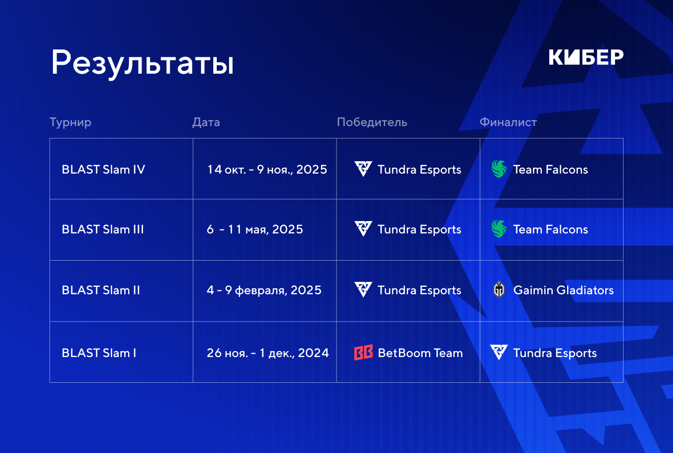 Серии турниров от BLAST совсем недавно исполнился всего год, за который ТО уже провел четыре чемпионата. И за 2025-й Tundra сыграла в финалах каждого из них! Выиграла 3 подряд и лишь в одном уступила BetBoom Team – именно тогда случилась драматичная историческая победа Сэйва над Найтфоллом.