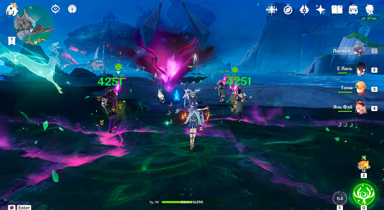 Возьмите Пиро персонажа 90 уровня с высоким мастерством стихий и используйте его навык, чтобы взорвать бутоны. На примере – Тома 90 уровня с приблизительно 850 мастерства стихий, его реакция нанесла 33215 урона.