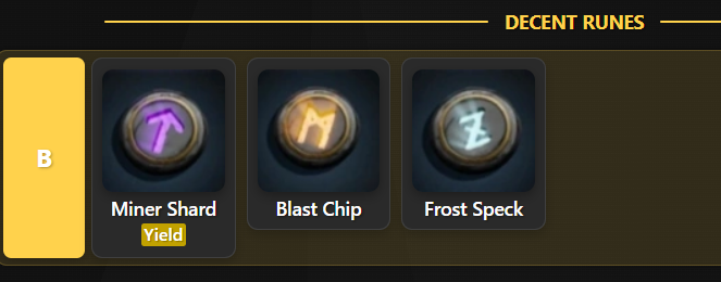 - Miner Shard (Осколок Шахтера) – Luck, Mine Power, Swift Mining, Yield. Лучшая руна для кирок. Каждая ее вариация усиливает добычу: скорость, силу, шанс получить дополнительную руду или удачу.