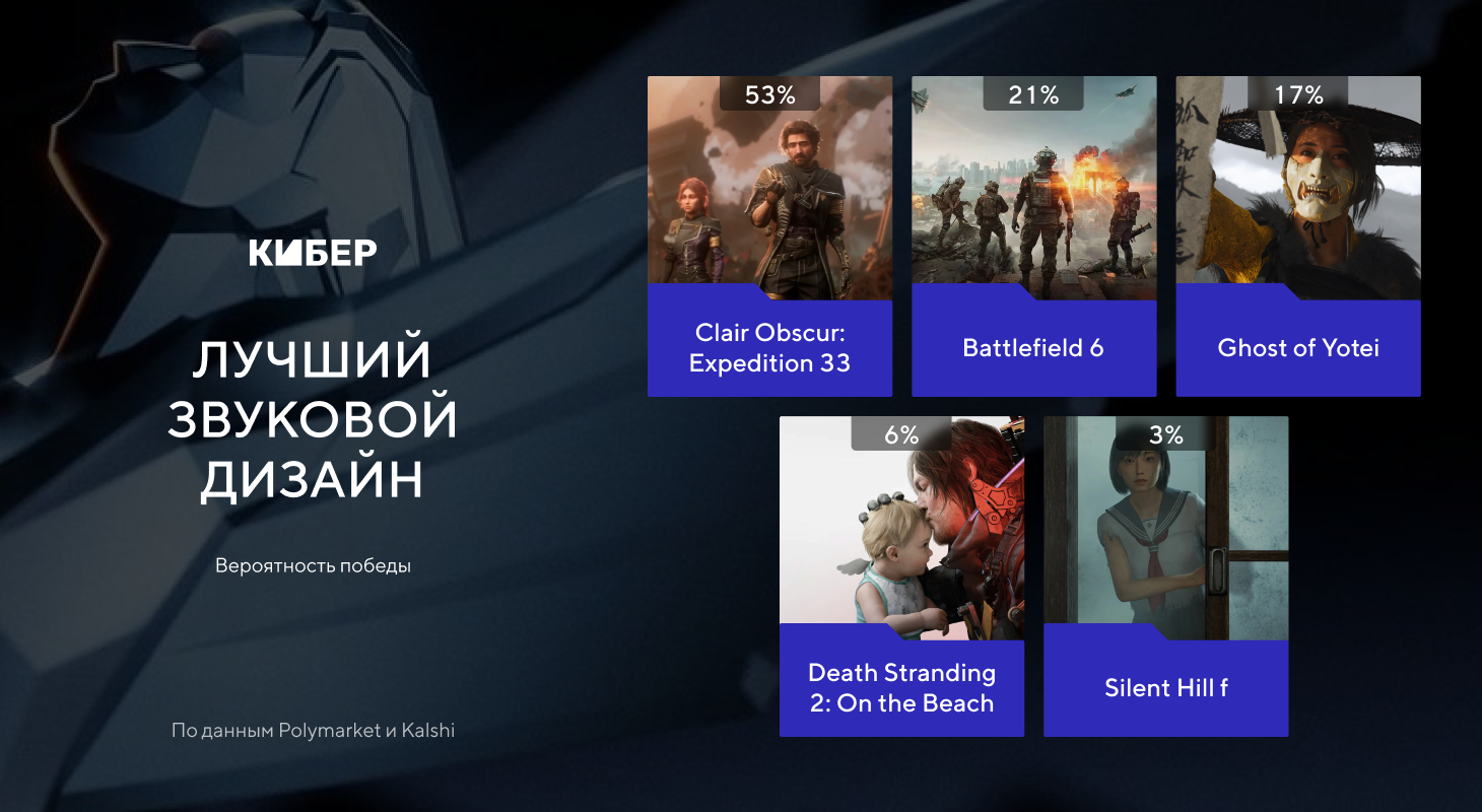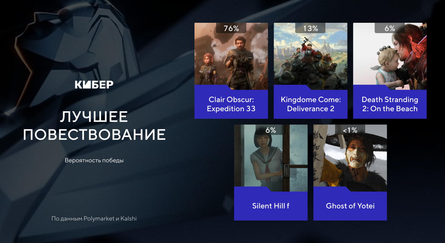 В России обе платформы нелегальны, поэтому ставить на них нельзя, но они помогут определить фаворитов премии. По сути, вероятность победы той или иной игры на Polymarket и Kalshi – это альтернативное голосование, ведь вероятность на этих платформах показывает, какое количество пользователей проголосовало за выбранный исход.