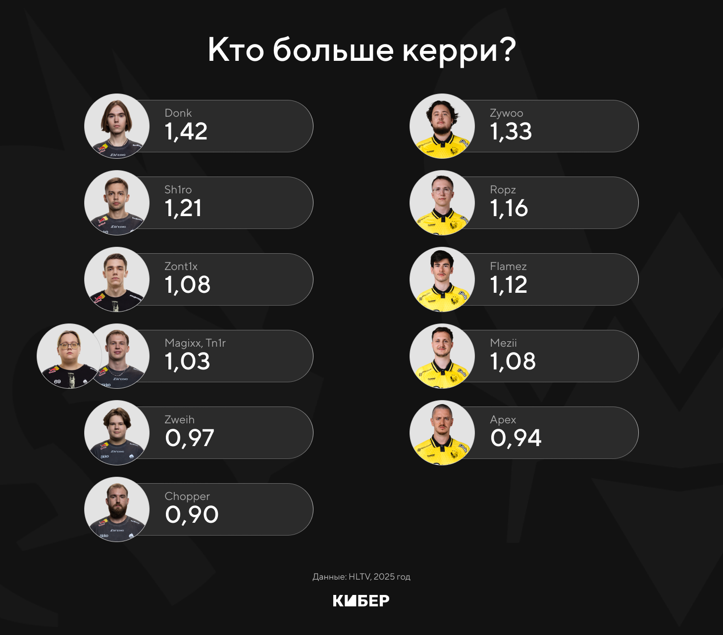 У него среди рифлеров нет тиммейтов уровня Ропза или Флеймза. Spirit зависима от Донка сильнее, чем Vitality – от Зайву.