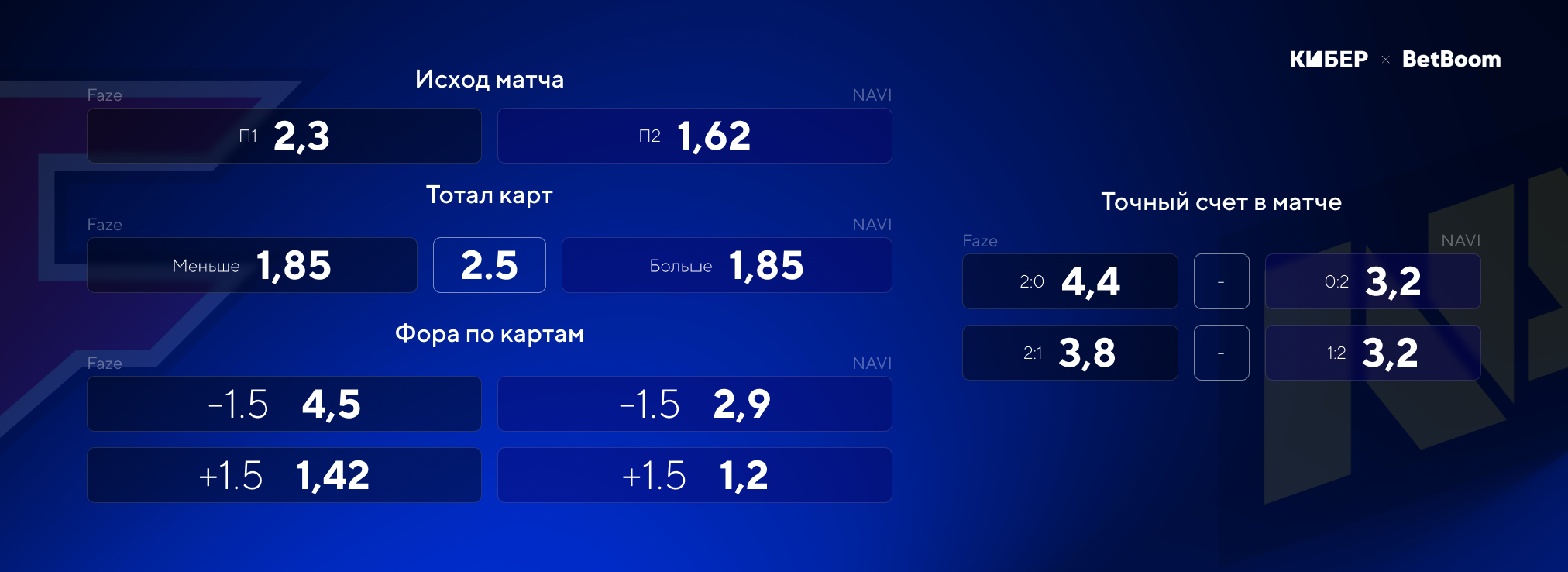 У каждой команды есть свои сильные карты. У Faze это Nuke и Inferno, где соперник чувствует себя не очень комфортно. В свою очередь у NAVI есть Dust2 и Mirage, где команда заметно превосходит противника по винрейту. У составов высокие шансы забрать свой пик и решить все на третьей карте. Тотал карт больше (2,5) BetBoom предлагает за 1,85.
