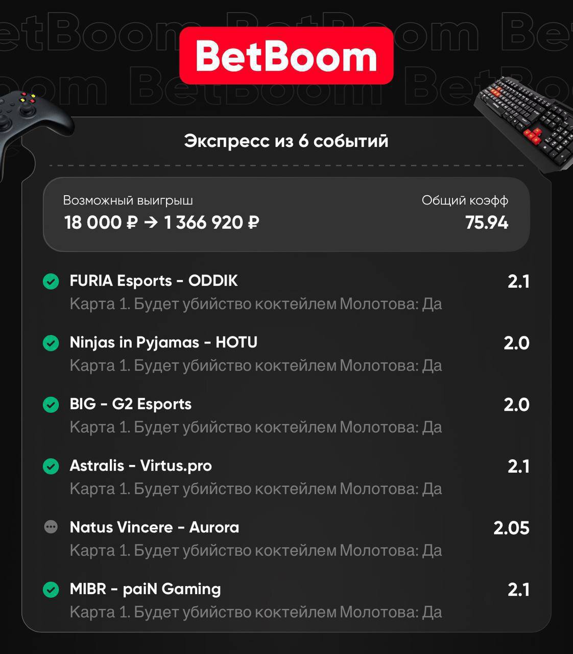 Стример выиграл экспресс на PGL Astana с общим коэффициентом 75,94.