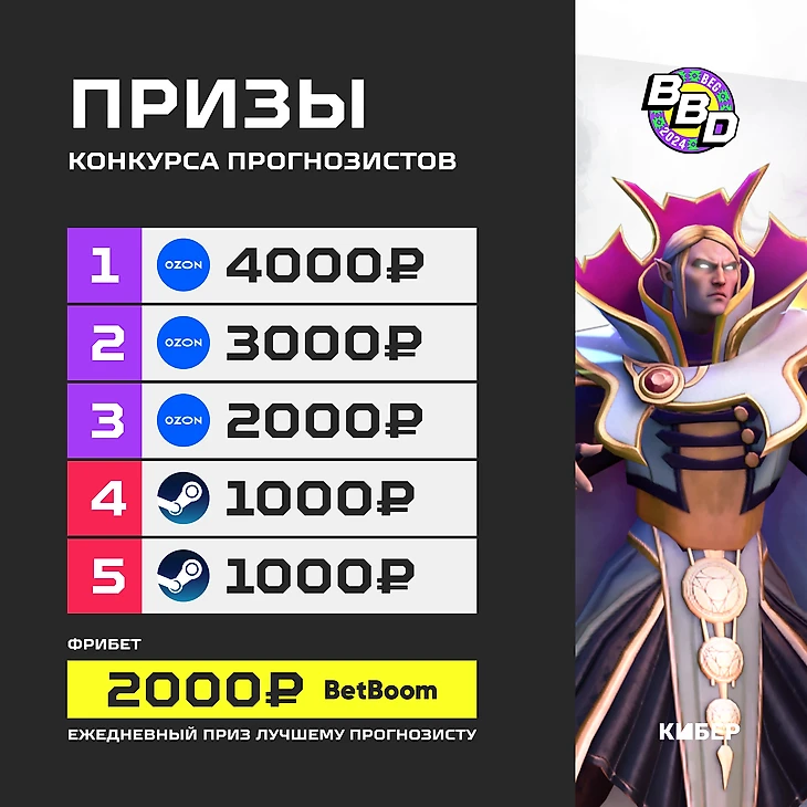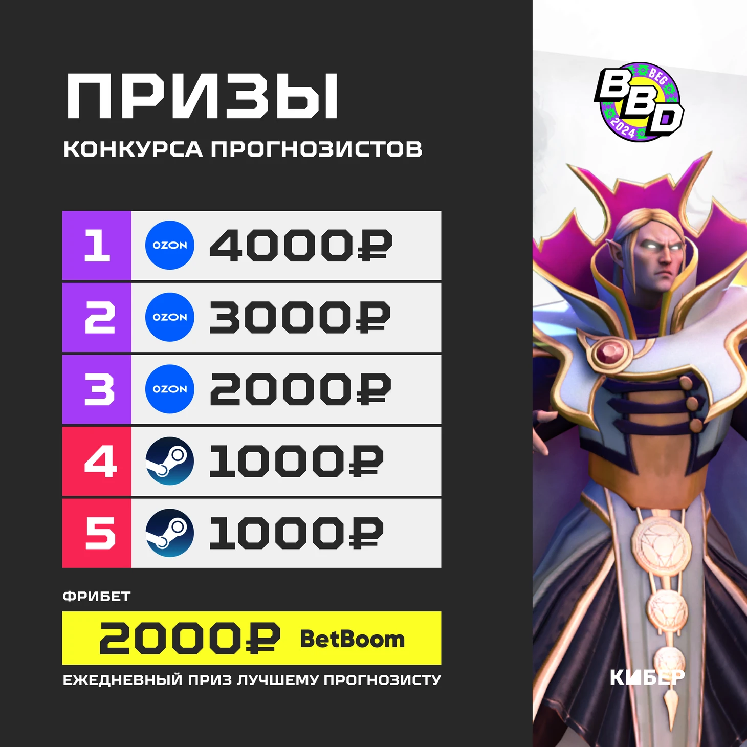 19 октября стартовала BetBoom Dacha Dota 2 2024. К турниру Кибер снова запускает конкурс прогнозов: пишите в комментариях предикты на матчи турнира, зарабатывайте баллы за верные прогнозы и выигрывайте призы.