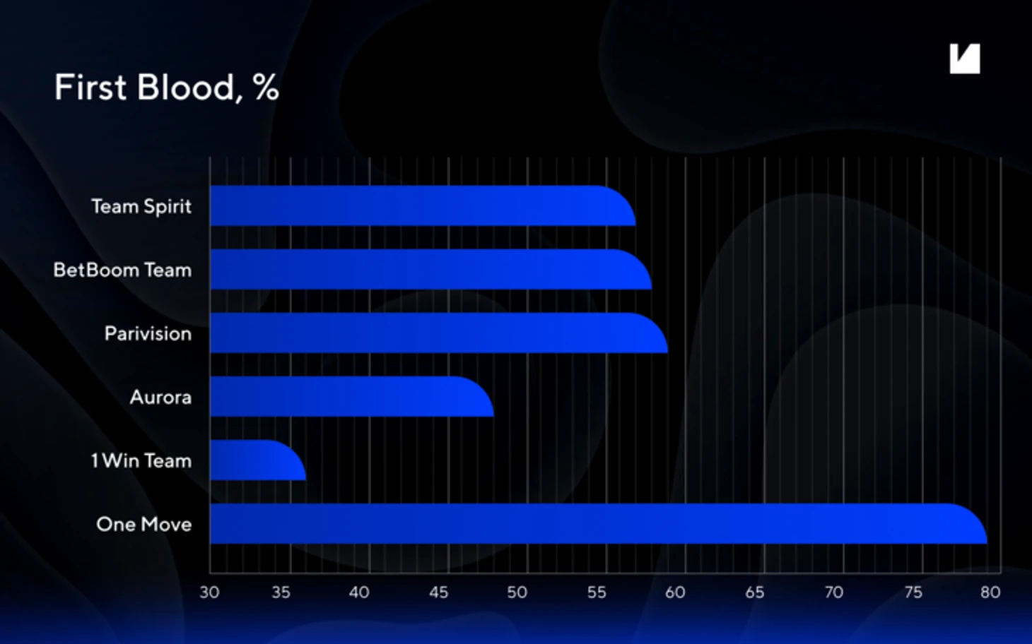Многие критикуют Spirit за плохой лейнинг, но статистика показывает, что команда первой пробивает 10 убийств на карте в 63% случаев. Звучит как вполне надежная инвестиция. Сюда же можно отнести PARIVISION и, внезапно, One Move, которая неплохо показывает себя в ранней игре. Чего не скажешь о 1Win.