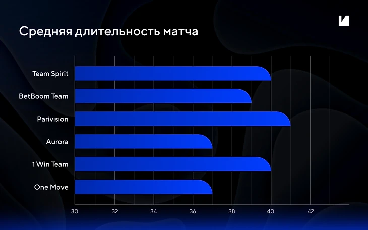 Возможно, одна из причин результативности PARIVISION в том, что команда проводит в игре больше времени, чем остальные. Правда, разница не настолько большая, чтобы это стало ключевым фактором.