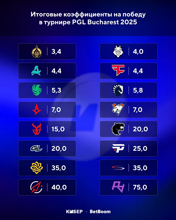 6 апреля в Румынии стартует PGL Bucharest с призовым фондом в $625 000. В отсутствие Vitality, Spirit и NAVI, у менее статусных коллективов появляется шанс блеснуть на тир-1 сцене. Мы изучили коэффициенты BetBoom и готовы предсказать победителя.