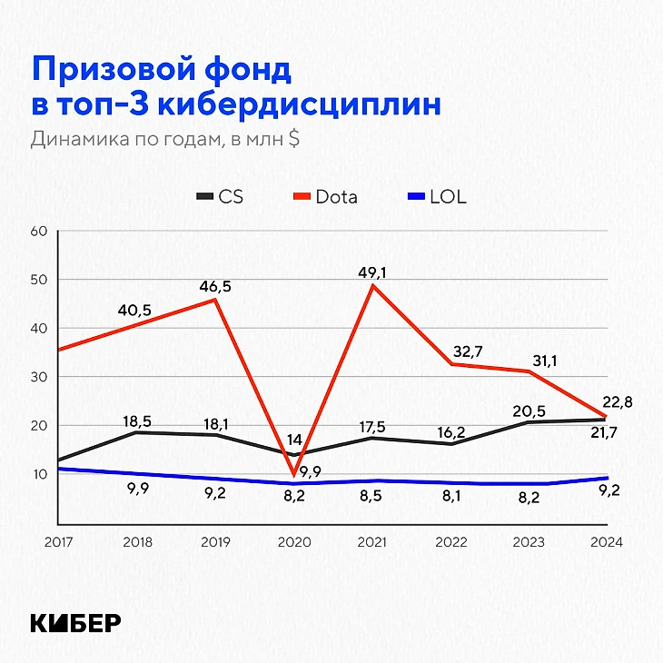 В 2021 году общая сумма призовых за год вернулась к привычным показателям, а в Доте достигла исторического максимума – 49,1 млн долларов. The International всегда считался главным турниром, а его доля от общих призовых составляла более 60%.
