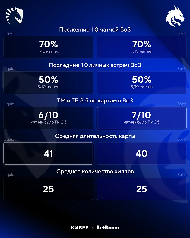 Матчи между Spirit и Liquid почти всегда получаются плотными: в четырех из пяти последних очных игр участникам потребовалось по три карты, чтобы выявить победителя. Оба состава показали не лучшую Доту в группе, поэтому ожидаем, что история повторится. Предлагаем поставить в BetBoom на тотал карт больше (2,5) с коэффициентом 1,88.