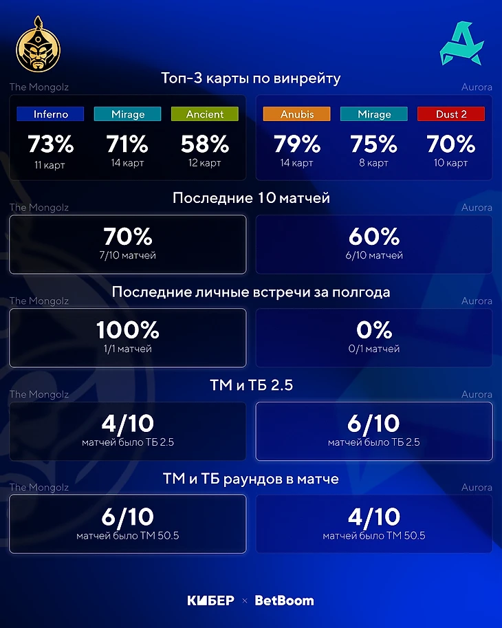 По той же причине мы считаем, что Aurora вряд ли навяжет борьбу монгольскому составу. Предлагаем поставить на победу The Mongolz с форой (-2,5) по раундам на первой карте с коэффициентом 2,25.
