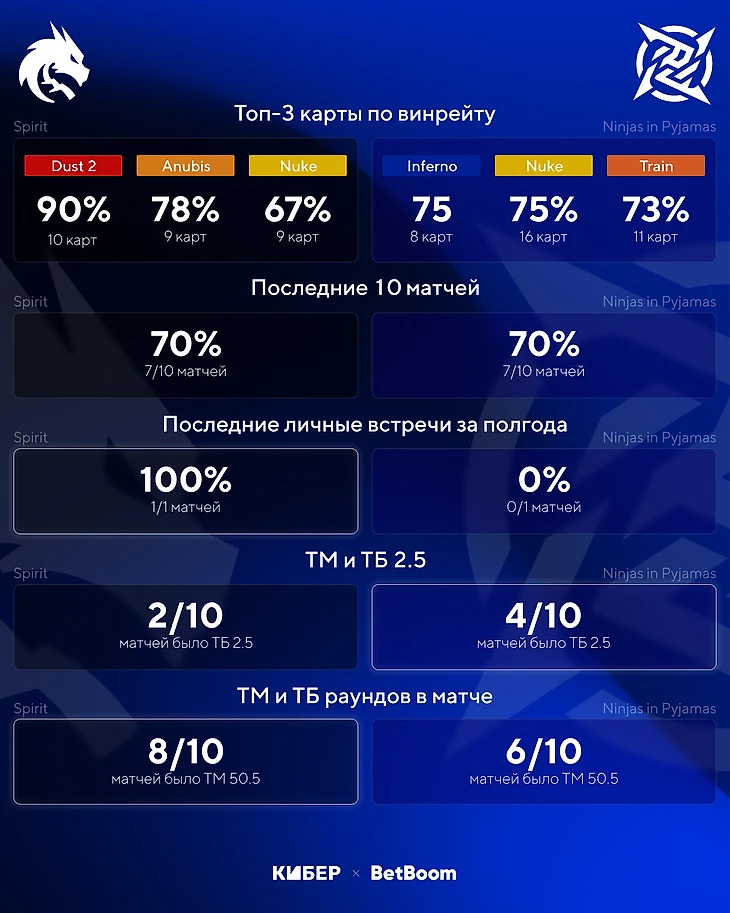 В целом, ожидаем уверенной победы Spirit на первой карте: BetBoom дает коэффициент 1,7 на ее фору по раундам (-3,5).