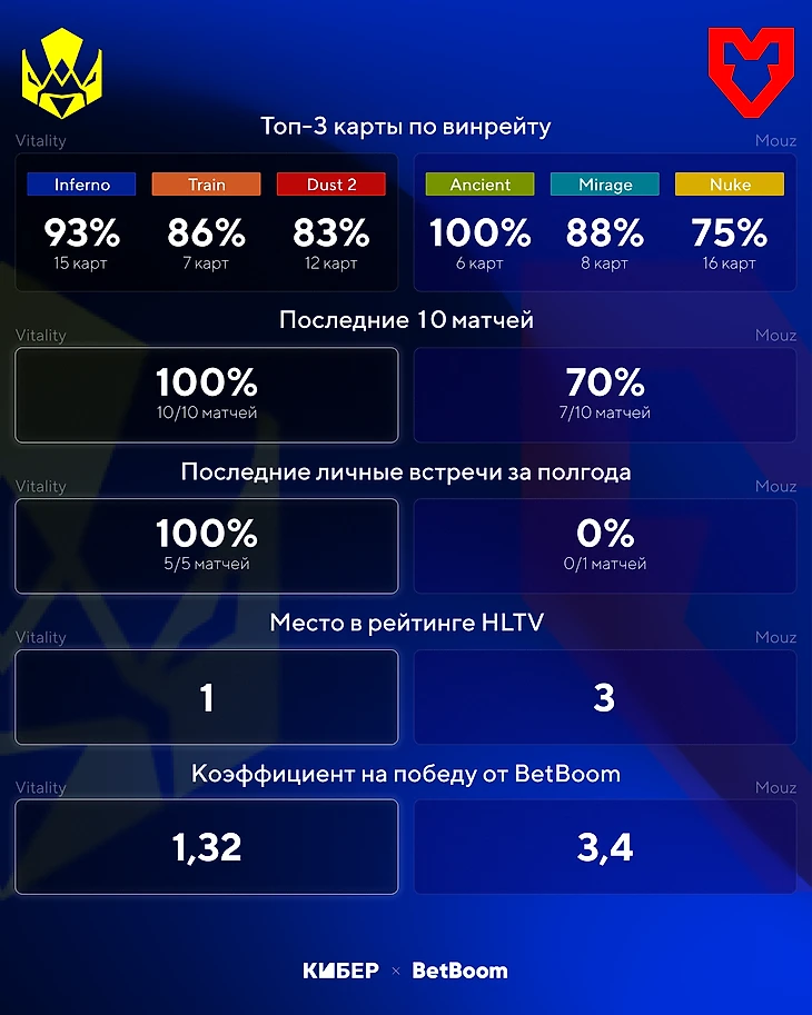 Матч не станет легкой прогулкой для потенциального победителя с любой стороны: ожидаем полный матч из пяти карт. Аналитики BetBoom оценили тотал карт больше (4,5) на коэффициент 2,7.