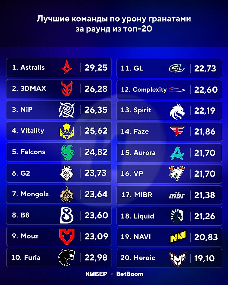 ➢Astralis с учетом показателей Кэдиана лидирует по урону гранатами с солидным запасом.