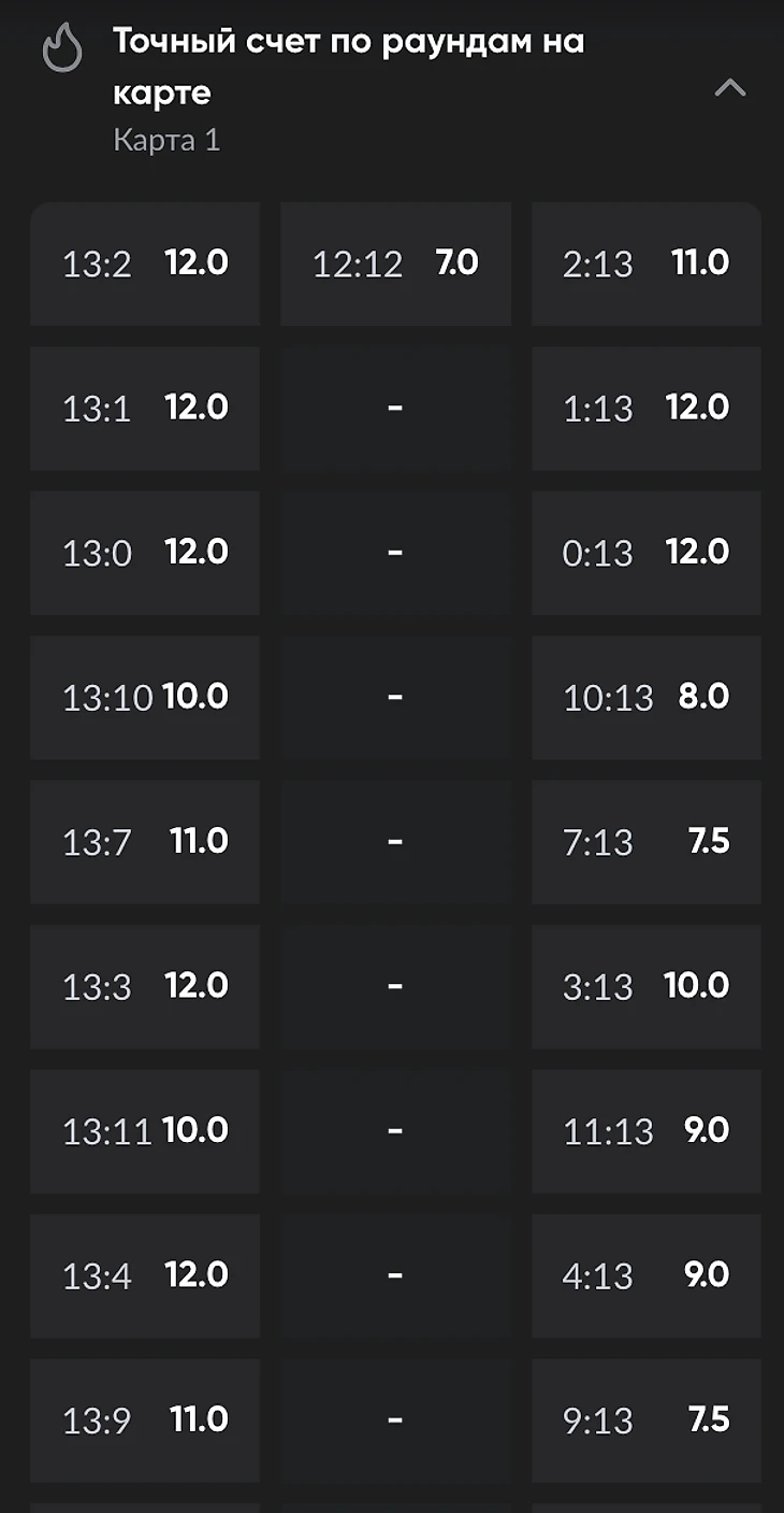 Точный счет по раундам. Используется для ставок на одной карте. В CS карта состоит из 24 раундов. После 13-й победы в раунде игра останавливается. В случае ничьей начинается овертайм. Получается, точный счет по раундам может быть либо 12-12, либо 13-Х в пользу одной из команд.