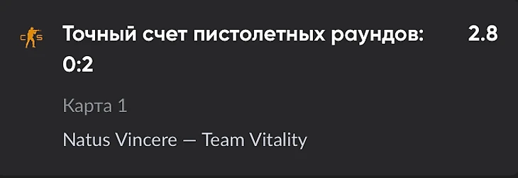 Точный счет пистолетных раундов на карте. 1-й и 13-й раунды на каждой карте – пистолетные. Можно поставить на исход этих раундов. Всего три варианта исхода: 1-1 или 2-0 в пользу одной из команд.