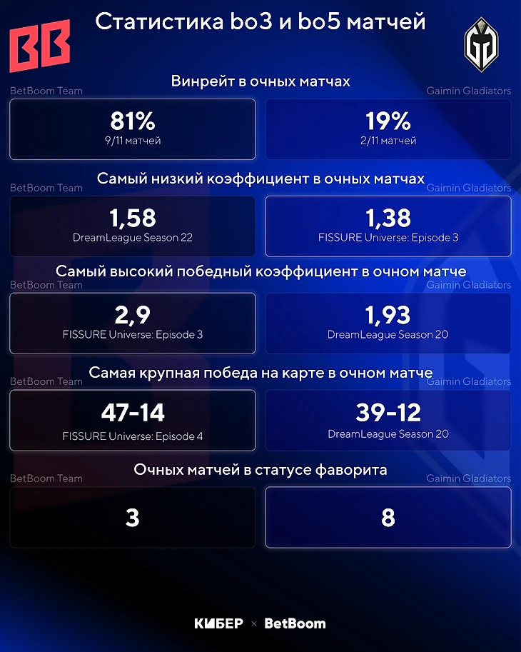 К матчу на FISSURE Universe: Episode 4 GG вновь подходили фаворитом, и вновь BB Team устроила разгром на третьей карте 41:10. В финале ситуация перевернулась: BetBoom Team стала фаворитом с коэффициентом 1,62. Состав легко забрал финал со счетом 3:0.