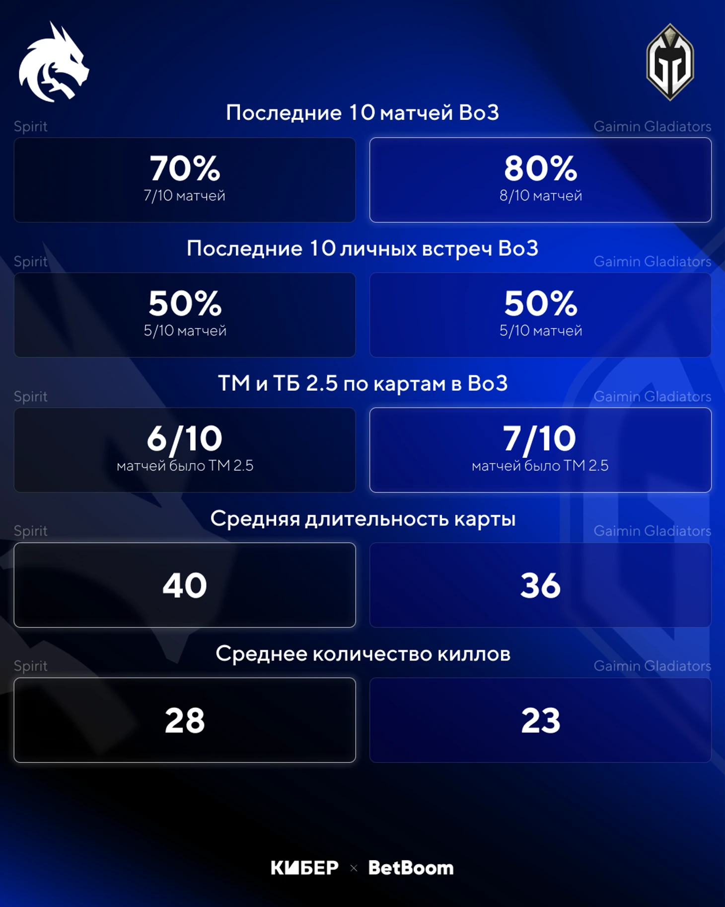 GG ставят на быструю игру и быстрый захват преимущества: состав выиграл гонку до 10 киллов на 6 из 8 карт турнира. Можно поставить на этот исход на первой карте против Spirit с коэффициентом 2,05.